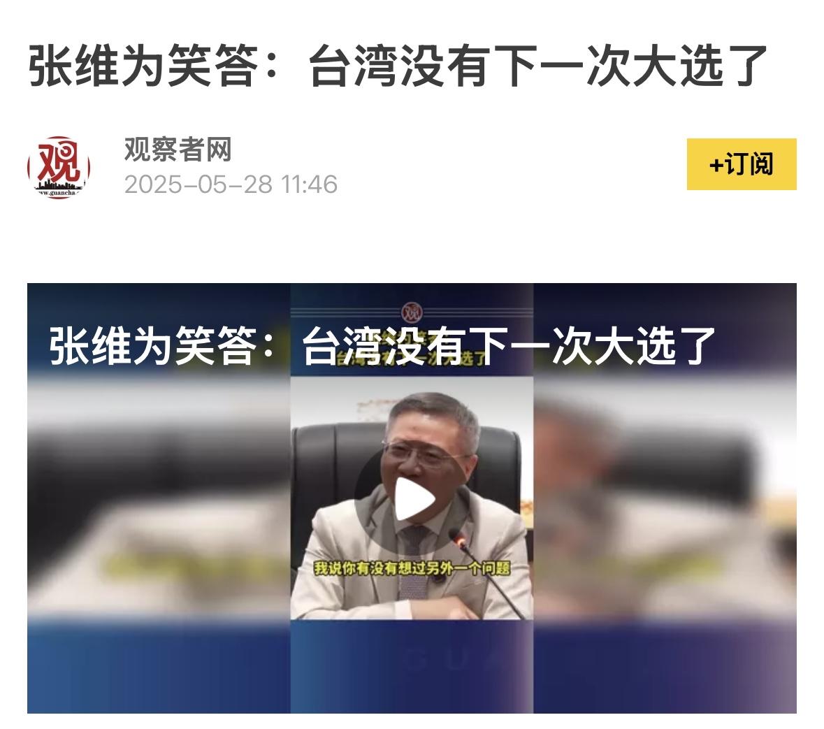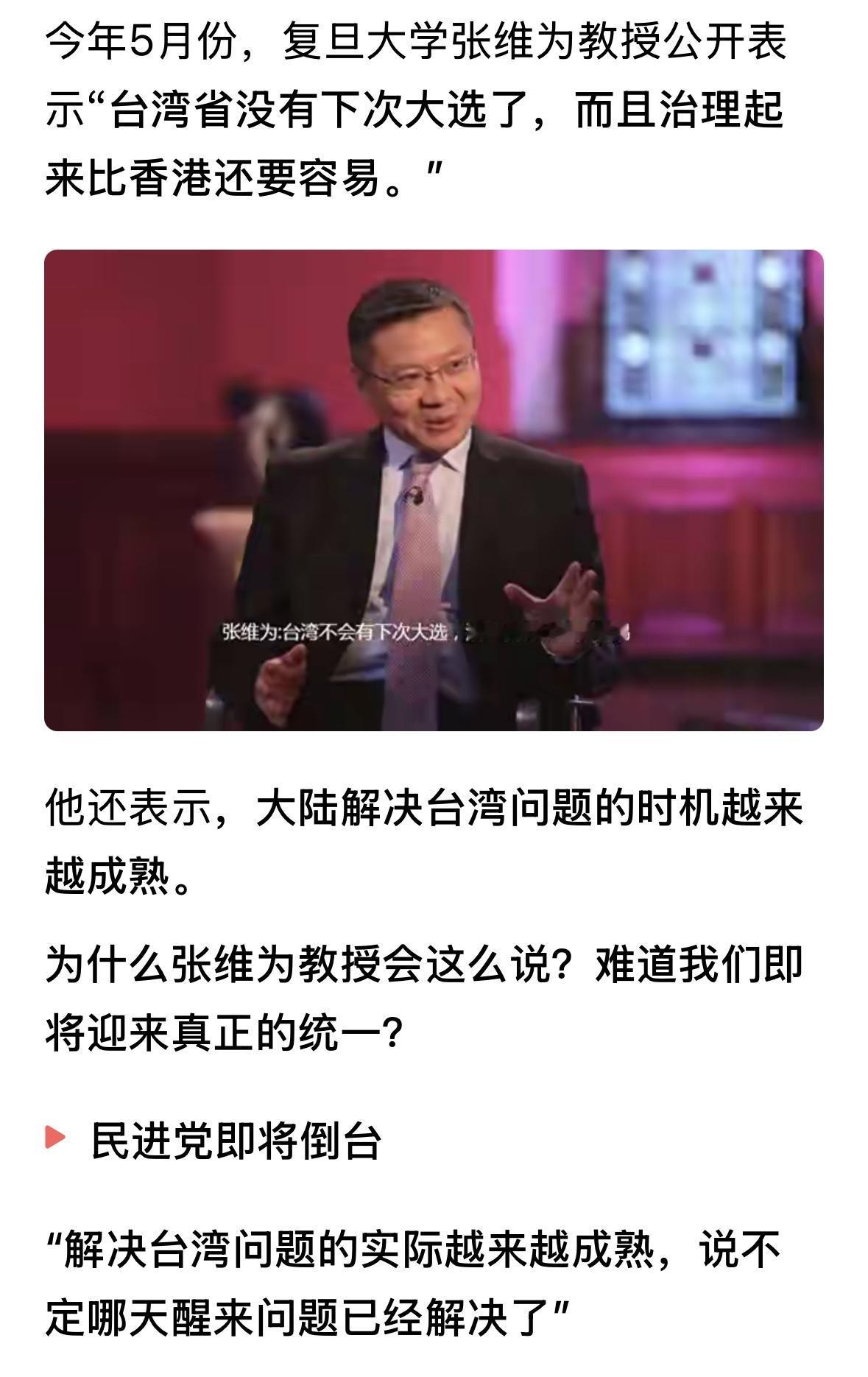 官方正式回应张维为台湾没有下一次大选的言论,张维为的这一言论,影响很大,成为大陆
