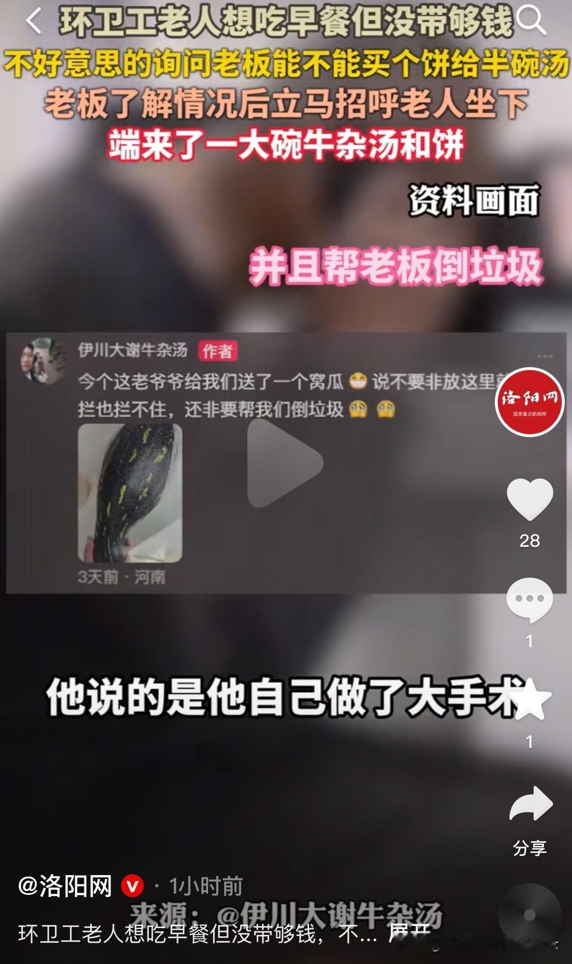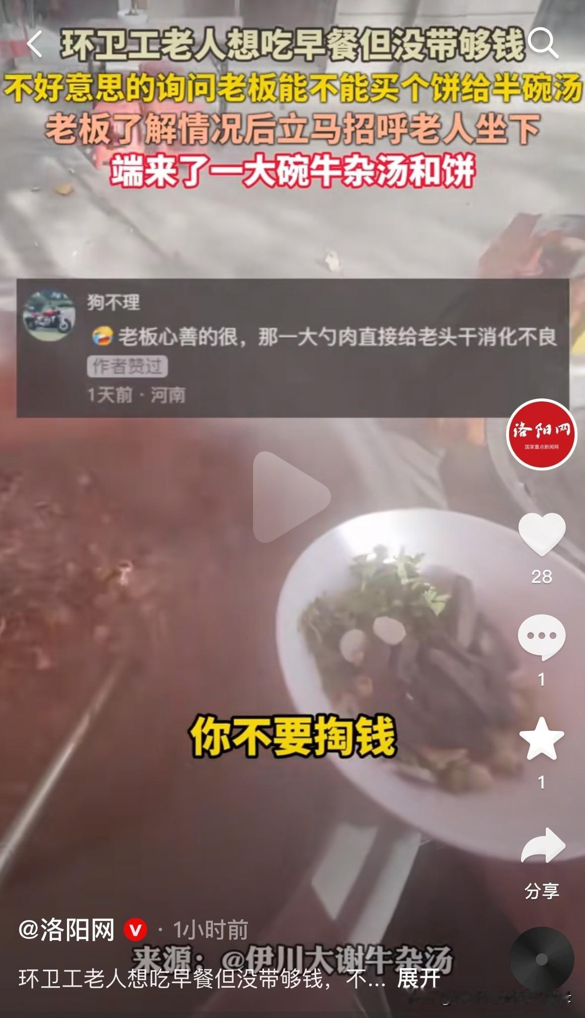 这老板想不发财都难啊! 河南洛阳,一环卫工大爷手捏着皱巴巴的零钱,来到牛杂汤铺,小心翼翼的问老板,自己没带够钱,能不能盛半碗汤?老板接下来的做法感动无数网友。 大爷跟老板讲,由于早晨换衣服忘记多带钱了,浑身上下只剩两块钱,能给能买一块钱的馍,然后给盛半碗汤。 老板听完二话没说,就给大爷舀了一碗满是料的牛杂汤,又给他拿了一个热乎乎的烧饼,告诉他放心吃不要钱。 大爷对老板连连感谢,老板讲,感谢啥呀,谁没有点难处。 后来才知道,大爷做了胃切除的手术,因此他的孩子也花了不少钱,为了能减轻点家里的负担,他就出来扫大街挣钱。 大爷觉得免费吃喝特别不好意思,第二天给老板送来了自己种的窝瓜,还非要帮老板倒垃圾。 这个新闻看得心里暖暖的。这年头愿意为陌生人多一份善意的老板太难得了,真让人动容 这份温暖的给予,不仅是热汤与烧饼,更是困境中的尊严与体面。 而大爷以窝瓜和劳动回馈恩情,更显淳朴可贵。这善意的双向流动,照见了普通人之间最真挚的温情——善良遇见感恩,便是人间最动人的风景。微光虽小,却能照亮世界。
