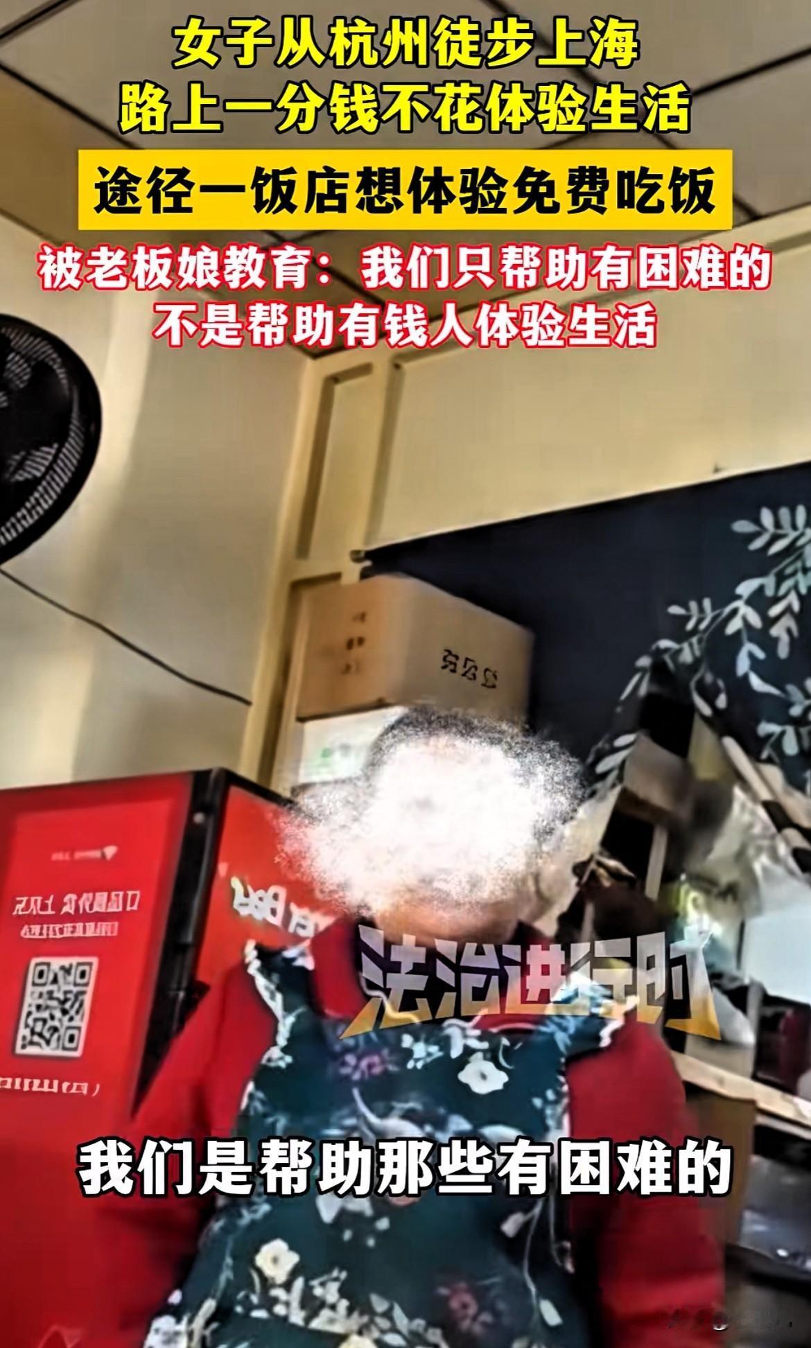 “想免费蹭个饭吃太难了!”女子辛辛苦苦从杭州徒步到上海,想不花钱体验一下“蹭饭”,来到饭馆说明情况后,却被老板娘怒斥:“你们有钱人一顿饭钱都舍不得花,我们只帮助有困难的人!”,女子只能无奈离去! 这样太不给面子了,女子本想着这次旅途,能体验一些免费吃饭,不但路人不肯帮忙,就连饭馆老板也拒绝了女子的要求,弄得女子非常尴尬。 这事也是引起网友热议,有网友说:“支持老板娘,这种人就是纯白嫖,所谓体验,就是有钱人不想花自己的钱,却想花别人的钱,可能吗?” 还有网友说:“她这体验课值了,这老板娘就是她这堂课的老师!” 我觉得,什么叫体验生活?一路上捡纸壳子饮料瓶,或者洗碗打工挣钱,自己动手丰衣足食,而不是想着利用别人的善良,一路白嫖。 善良是应该帮助那些真正苦难的人,如果真的遇到苦难了,大家一般都会伸出援手之手,但不要拿别人的善良去消遣,大家说呢? (信息来源:法治进行时)