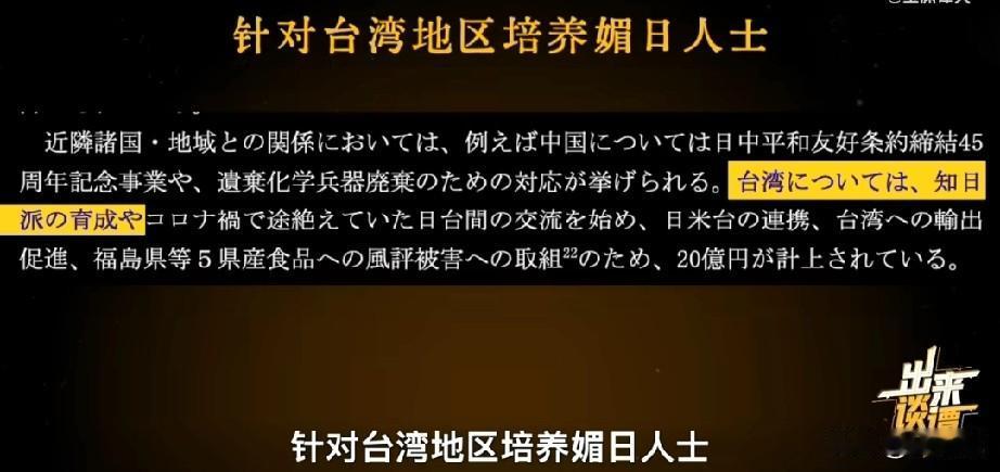日本砸131亿日元在台搞媚日宣传,多年暗养亲日势力 台当局解禁福岛“核食”、赖清德媚日作秀的背后,是日本的长期渗透。日本外务省预算显示,3年来累计拨款超131亿日元,专项用于台湾地区媚日宣传与亲日人士培养。131亿巨款怎么花?究竟买通了谁?日本对台的媚日布局,藏不住了。日本涉台战略