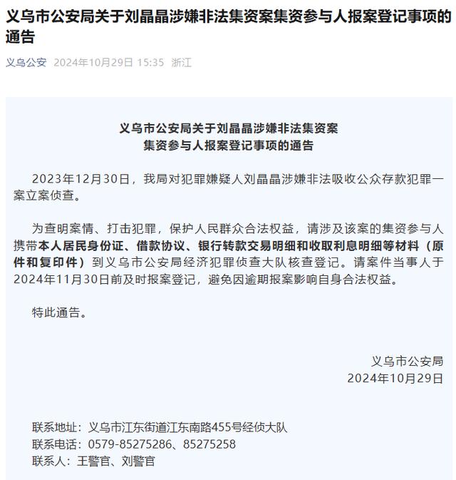 此前义乌公安也有在通告中公布嫌疑人全名的情况,例如2024年12月30日,其曾发布“关于刘晶晶涉嫌非法集资案集资参与人报案登记事项的通告”,亦是是非法集资案,同样公布嫌疑人全名。