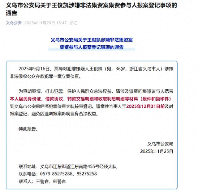 11月25日,义乌市公安局发布通告:2025年9月16日,我局对犯罪嫌疑人王俊凯(男,36岁,浙江省义乌市人)涉嫌非法吸收公众存款犯罪一案立案侦查。