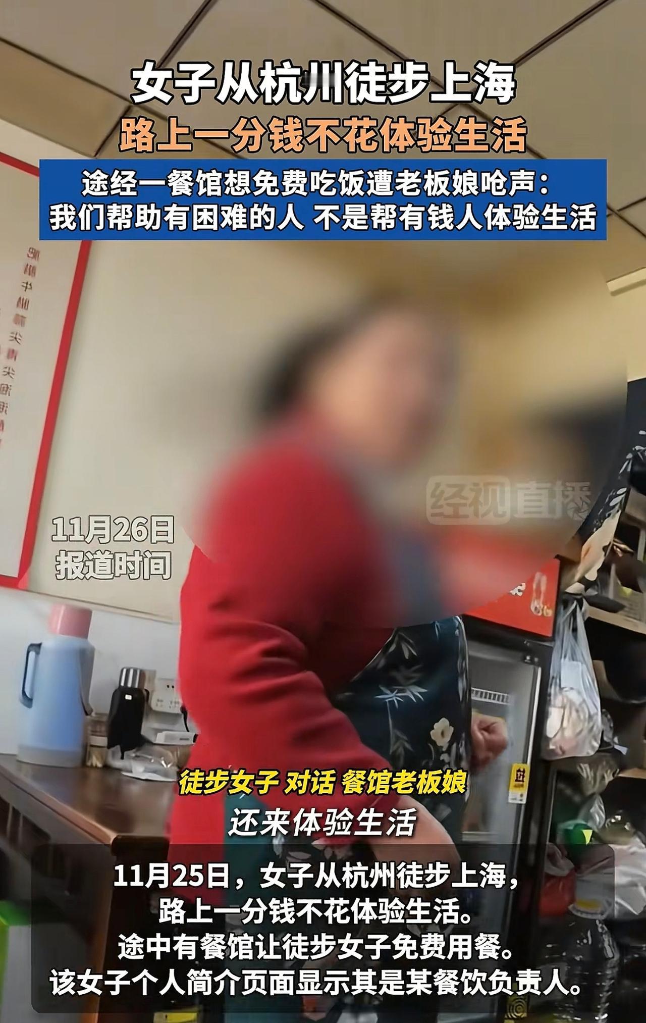 老板娘真是人间清醒,她说“我们只帮有困难的,不帮有钱人体验生活”。 一位博主打着口号,徒步从杭州走到上海,不花一分钱,路过一家饭店想免费吃饭,结果被老板娘深深“教育”了。 本来就是为了博流量增加关注度,可是不能把所谓的“0消费”建立在其他人的利益上,如果真是遇到困难,肯定都会实实在在帮一把,吃顿饭也不是什么大事,但是不能恶意消费大家的善良,因为你的苦在其他人看来更多是自找苦吃。饭店善良老板娘