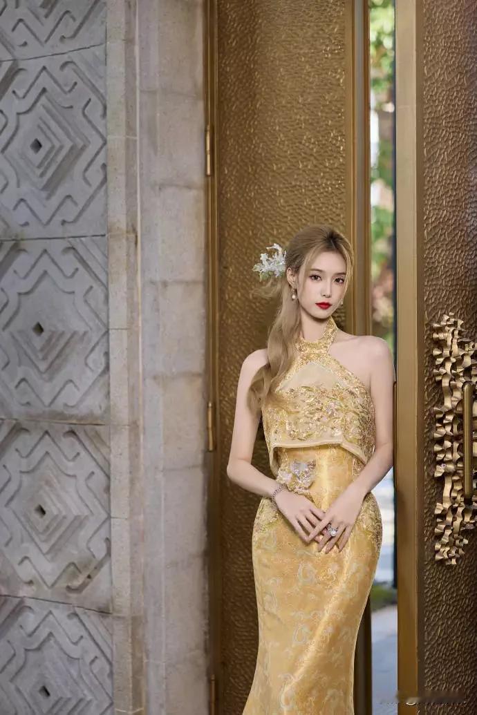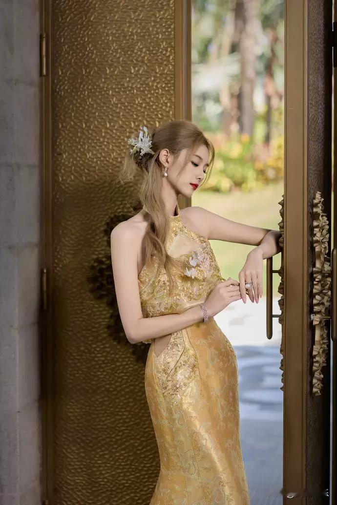 徐艺洋在三亚国际婚纱周的两套造型堪称东方美学教科书。她身着改良金色旗袍时,盘扣与