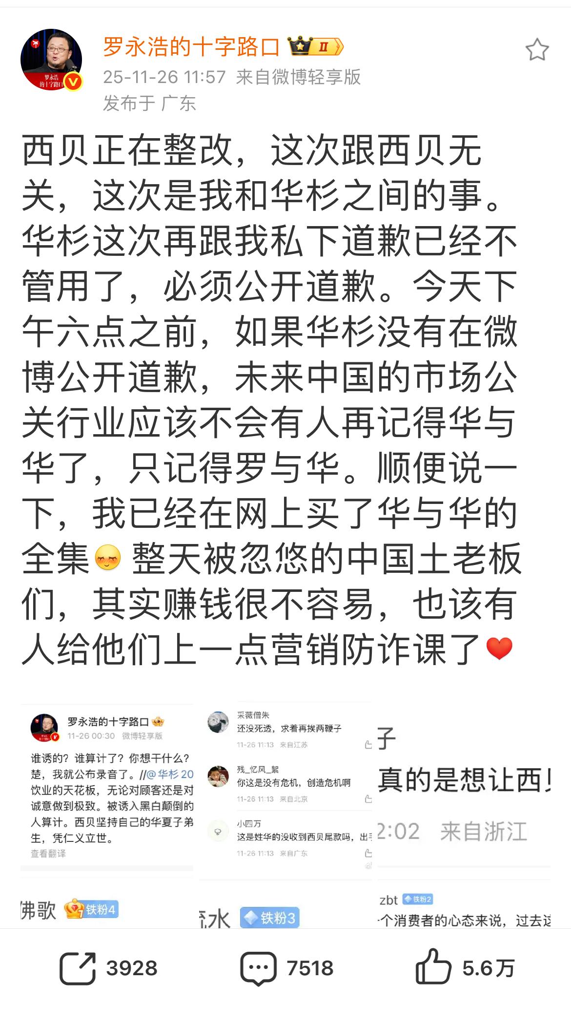 罗永浩这样玩下去,估计离封号不远了。虽然这次是华与华挑起的矛盾,罗永浩希望他们公开道歉,但是到6点钟并没有等来。这种骂战,是罗永浩擅长的,吵架他就没输过,但是挑起大众,制造对立,这是目前的互联网生态所不容的,特别是拥有巨大网络影响力的人。看看最近被封禁的那些网红们。老罗俞敏洪 罗永浩 罗永浩,冯唐