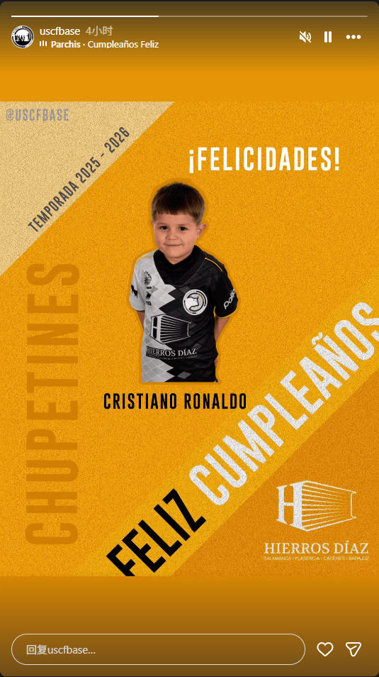 虎扑11月26日讯西协甲球队萨拉曼卡联合(Unionistas)日前在青训官方社媒发布限时动态,为梯队中一名叫克里斯蒂亚诺·罗纳尔多(CristianoRonaldo)的小球员庆祝生日。