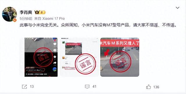 11月26日,小米汽车副总裁李肖爽发文辟谣,称网传撞人事件与小米完全无关,小米汽车没有M7型号产品,请大家不信谣、不传谣。