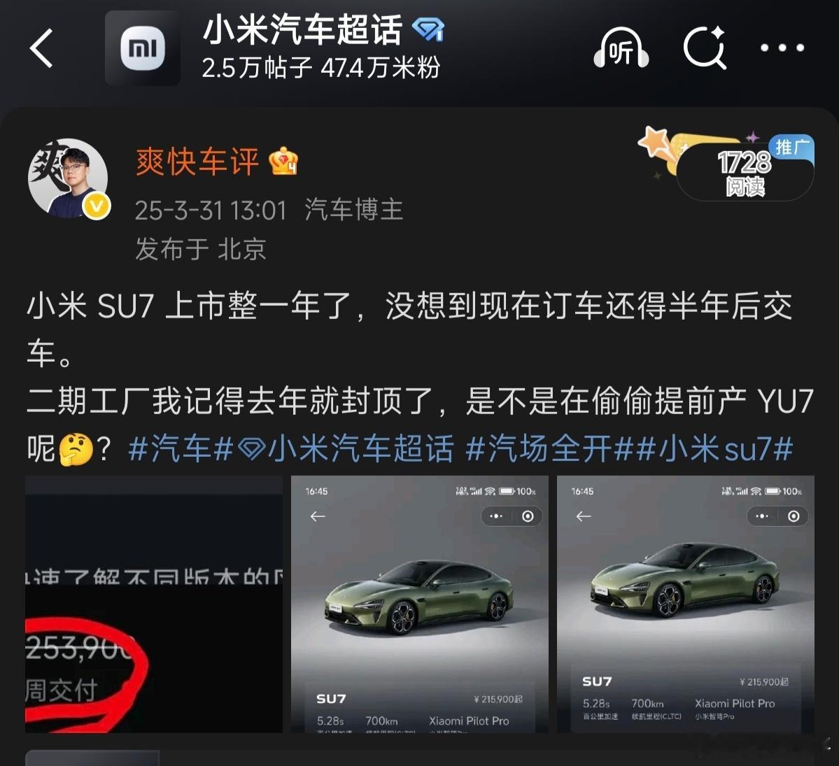 小米 SU7 Pro 现在 4 周就能交付了(图 1);3 月底 pro 版交付还得 45 周(图 2);也就是说从 3 月底到现在,小米 SU7 基本都是在生产历史订单,新增订单数很少了,甚至还会有退订的;现在订SU7,多少有点 49 年入国军的感觉了毕竟 SU7 距离发布已经快 2 年了,按现在车圈更新卷的频次,应该今年秋季发布会就有改款 SU7 才对的,估计是怕影响 YU7 订单就没来,也导致新增订单很少了,现在米儿又是风口浪尖,估计明年春季改款 su7才会来了;小米su7小米
