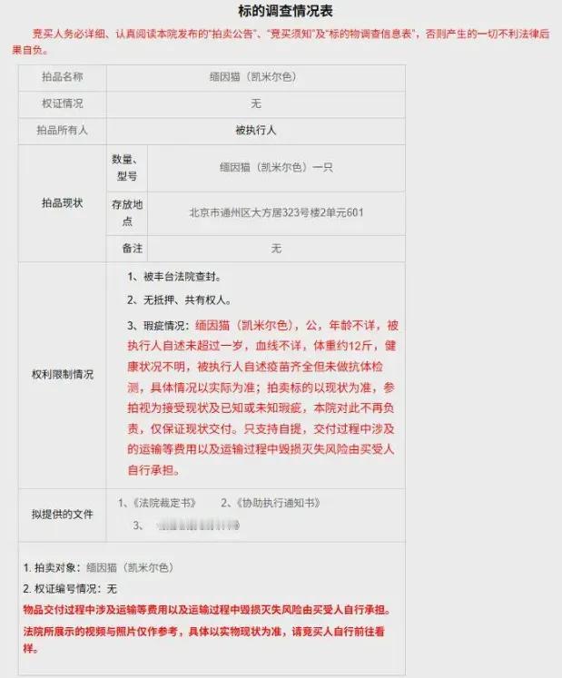 这年头,猫都得替主人还债了!一只凯米尔色缅因猫被法院挂上阿里资产平台,标价4500元等着新主人带走。围观群众超3000人,可谁想过这只猫的心情? 它不过一岁左右,疫苗齐全却莫名成了法拍品,只因为原主人卖猫时惹了合同纠纷。法院冷冰冰写健康状况不明,风险自担,可猫不是古董,它是活生生的陪伴啊!8月那只被60万人围观的狸花猫最后逃过一劫,但这只缅因猫的命运仍悬着。自提,无售后,仿佛一件瑕疵商品。 法律眼里,宠物是资产。但人间烟火里,它是家人。这场拍卖撕开的,正是冷硬条文与温热情感的裂痕。别说猫不懂,它只是不会说话罢了。