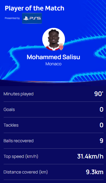 不过,欧足联技术小组依然肯定了本场9次为摩纳哥夺回球权的他的发挥,将他评选为全场最佳球员。