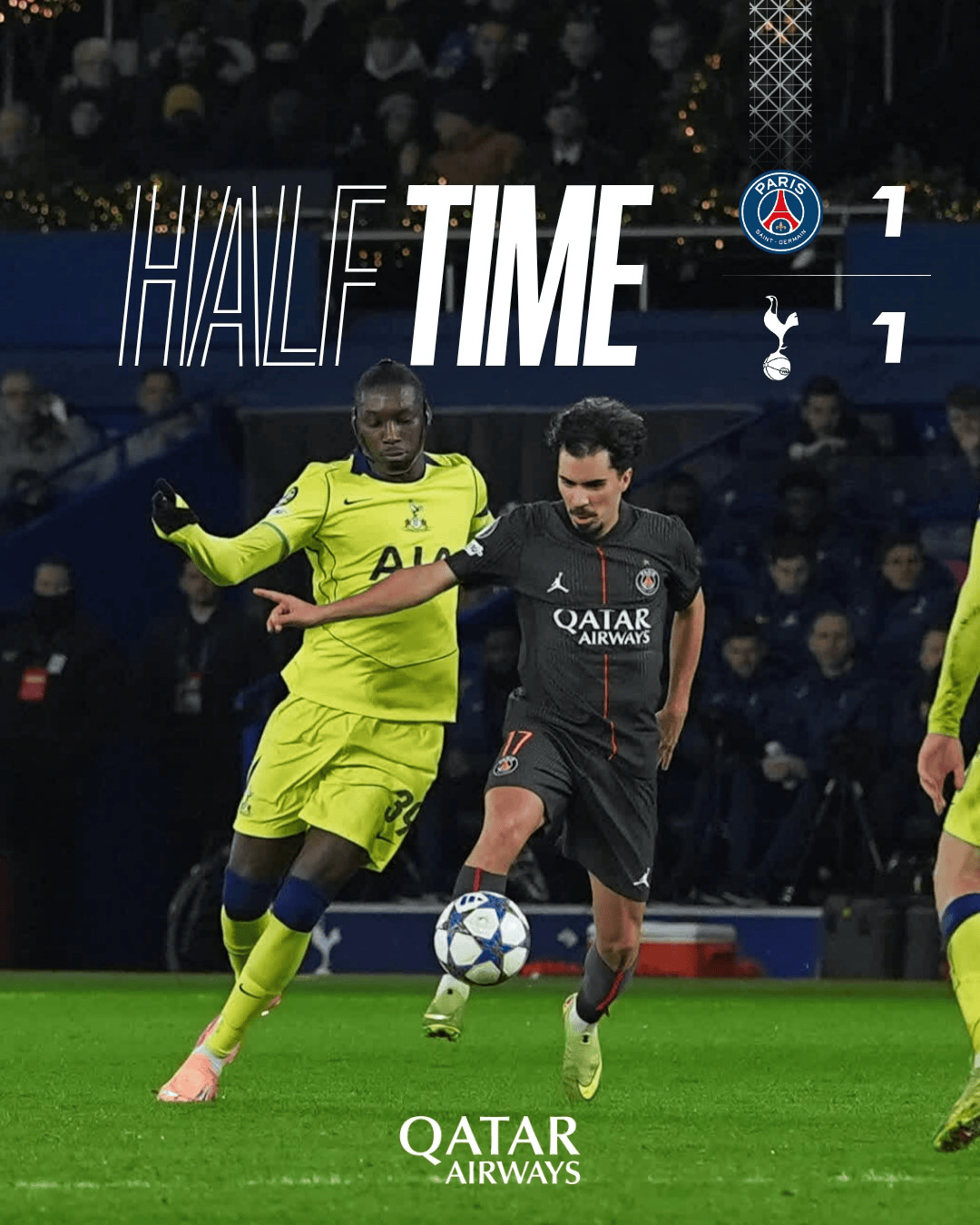 虎扑11月27日讯欧冠联赛阶段,巴黎主场迎战热刺。上半场比赛结束,双方1-1战平。