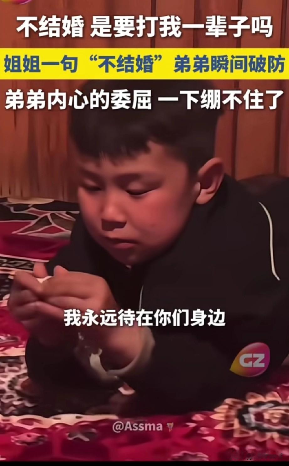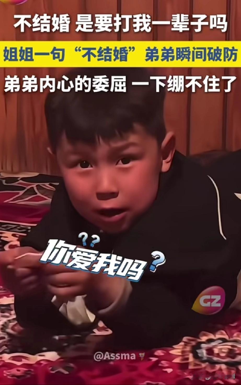 姐姐一直不结婚, 直接让年幼的弟弟破防了, 本来比姐姐着急的是弟弟, 直接嫁不出去发愁的还是弟弟, 姐姐表示要永远待在家中, 这可让弟弟不开心了, 看到小弟弟的反应, 还要问道你爱我吗? 弟弟点了点头, 心里肯定在想不结婚可不行, 不结婚是想要打我一辈子吗? 看到弟弟忍不住的哭泣, 因为弟弟不想让自己结婚, 殊不知弟弟巴不得你早点嫁出去! 大家对于弟弟希望姐姐早点嫁人怎么看? 不结婚的心情 姐姐 不结婚的姐姐 哥哥姐姐先结婚 哥哥姐姐结婚了