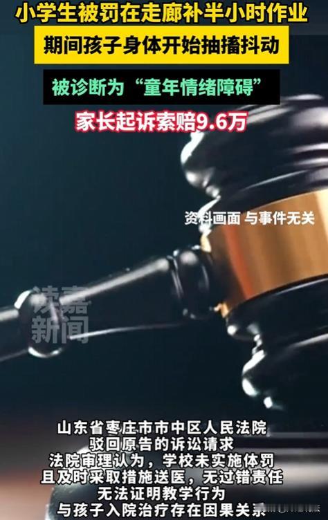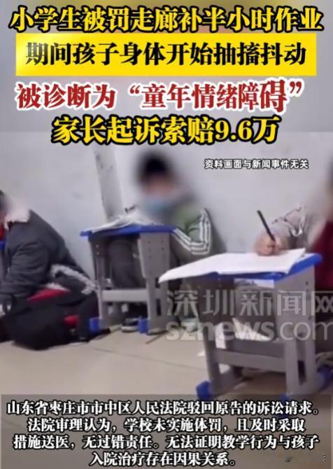山东枣庄,某小学六年级,有学生没完成作业,老师让其到走廊补作业,期间无打骂等体罚行为,30多分钟后学生回班,老师察觉其状态不对,赶忙通知家长,家长没当回事称忙来不了,老师放心不下,派两名学生护送其回家,事后学生被查出童年情绪障碍,家长认为是老师体罚导致的,向学校索赔9.6万余元,索赔不成便将老师和学校告上法庭,最终法院判了。 据悉,六年级的小张和几个同学没写完作业,被班主任叫到走廊补作业。 班主任虽着急,但全程没打骂、没说过激话,更无体罚,自己则在教室处理事务。 半小时后孩子们陆续回班,班主任发现小张不对劲,平时活泼的他蔫头耷脑的。 家长一口咬定,就是那次走廊补作业,让孩子受了天大的委屈,心里留下了阴影,这才得了病。 于是,气势汹汹地跑到学校,要求赔偿9.6万余元。 学校和老师觉得这锅背得冤枉,双方协商没达成一致,家长一纸诉状,把老师和学校告上了法庭。 家长觉得孩子平时好好的,就因为被老师叫到走廊补作业,回来就成那样了,这病肯定是补作业闹的。 他们找了好几家鉴定机构,想证明孩子这样的状况和补作业有关,可找了6家,都没能拿出有力证据。 学校和老师,也是有理有据。 老师提供了监控视频,从视频里能清楚看到,老师让孩子们补作业的时候,没有打骂,也没有体罚,就是正常的教育管理。 而且,老师发现小张状态不对后,马上就联系家长,家长没当回事来不了,老师还不放心,安排了两个学生护送小张回家,这应急救助责任可是尽到了。 那么,家长能不能拿到那9.6万的赔偿?学校和老师到底有没有责任呢? 根据《民法典》第一千二百条规定,限制民事行为能力人在学校或者其他教育机构学习、生活期间受到人身损害,学校或者其他教育机构未尽到教育、管理职责的,应当承担侵权责任。 老师让没完成作业的学生到走廊补作业,这属于正常的教育管理行为。 从监控视频能明确看到,老师没有打骂学生,也没有进行体罚,不存在过错行为。 而且,老师在发现小张状态异常后,第一时间联系家长,在家长没及时到场的情况下,安排学生护送小张回家,这说明学校和老师已经尽到了相应的教育、管理以及应急救助职责。 家长的主张:孩子患病是因为老师让补作业,可找了好几家鉴定机构,都没办法证明孩子的童年情绪障碍和补作业这件事有因果关系。 在法律上,谁主张谁举证,家长没办法提供证据证明自己的主张,那就得承担举证不能的不利后果。 所以,综合来看,学校和老师在这件事里,没有违反法律规定的行为,也不存在未尽到职责的情况,家长要求赔偿的诉求缺乏事实和法律依据。 家长认为老师让补作业,就是教育管理不当,这种说法成立吗? 依据《教育法》规定,学校和教师有对学生进行教育管理的权利和义务。 老师让没完成作业的学生补作业,这是为了督促学生学习,属于正常履行教育管理职责。 只要在这个过程中,没有对学生进行打骂、体罚等侵犯学生权益的行为,就不算教育管理不当。 老师让补作业时没有不当行为,所以家长这种说法不成立。 家长没当回事,没及时到校,是否影响责任认定吗? 按照法律规定,家长作为监护人,有保护被监护人身体健康的义务。 老师发现小张状态不对联系家长,家长却因忙没当回事没及时到校,这是家长没有尽到监护责任。 在这种情况下,不能因为家长没及时到校,就把孩子后续出现问题归责于学校和老师,不影响对学校和老师是否尽到职责的责任认定。 法院经审理后认为: 老师让补作业属正常教育管理,无打骂体罚行为,发现异常后及时联系家长并安排护送,尽到相应职责。 家长无法证明孩子疾病与补作业有关,最终驳回家长诉求,学校不用承担赔偿责任。 在面对孩子的问题时,家长和学校都应该保持理性。 家长不能盲目地把责任推给学校,学校也要继续做好教育管理工作。