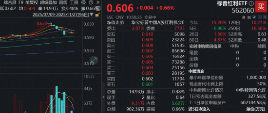 公开资料显示,标普红利ETF(562060)及其联接基金(A类501029、C类005125)被动跟踪标普中国A股红利机会指数(CSPSADRP),2005年至2025年9月末,标普A股红利全收益指数的累计收益率高达2469.11%,年化收益率17.73%。继九月初算力板块交易过热见顶后,市场或进入牛市整理期,增配红利资产作为资产压舱石的必要性提升。