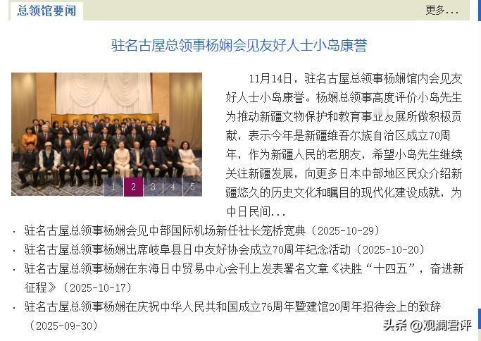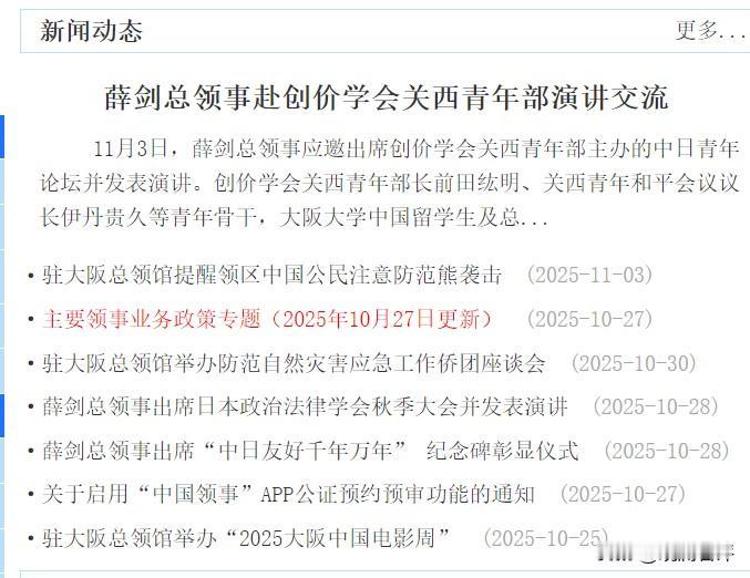 除大阪总领馆之外的其他各总领事馆新闻都进行更新,能够看出已经恢复正常交流活动,但大阪馆的信息还继续停留在11月3日。 走还是不走是个问题,走吧,好像灰溜溜;不走吧,工作难以开展。挺尴尬。 口不择言的网红认为对日越左越正确,所以为了自己的前途命运赌了一把大的。到底是爱国还是投机,再等等上面给他的认定。