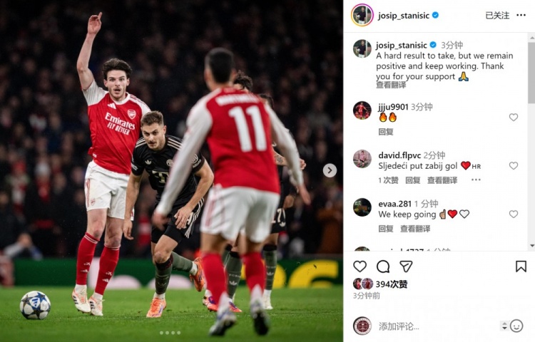 斯坦尼西奇社媒晒出比赛照片,配文:“这是一个难以接受的结果,但我们依然保持积极的态度,继续努力。感谢大家的支持。”
