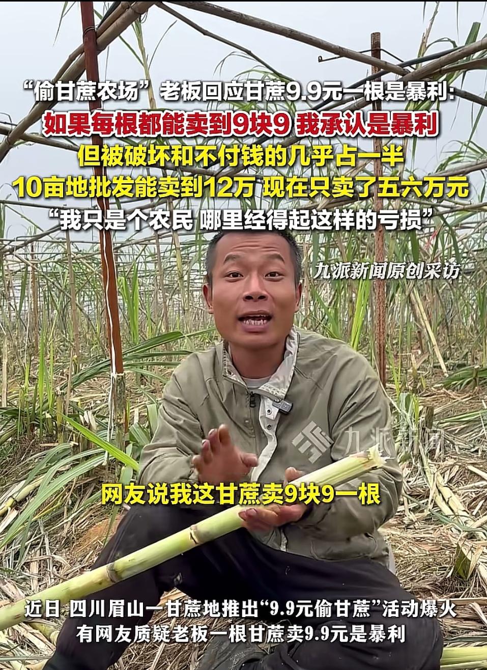有网友质疑老板一根甘蔗卖9.9元是暴利!我在想他会不会亏,或者是能持平不。农产品真的不能光看最后的利润,前期的栽种,施肥,除草,直到从市面上买到,中间还有更多的成本花在农产品的成长上,而且这种大规模种植的还要请人来帮忙,工钱也是一笔不小的开支。 9.9一根确实亏不到钱,但是老板现在面临的问题是,有的人花了9.9,甚至干了99的事情,偷偷旁边吃,这根砍来不喜欢就砍那根,踩坏的,故意拿走不付钱的,主要是损耗太大了。老板还请了那么多人扮演NPC,还要给发工资。 你觉得小伙是亏了还是赚了?