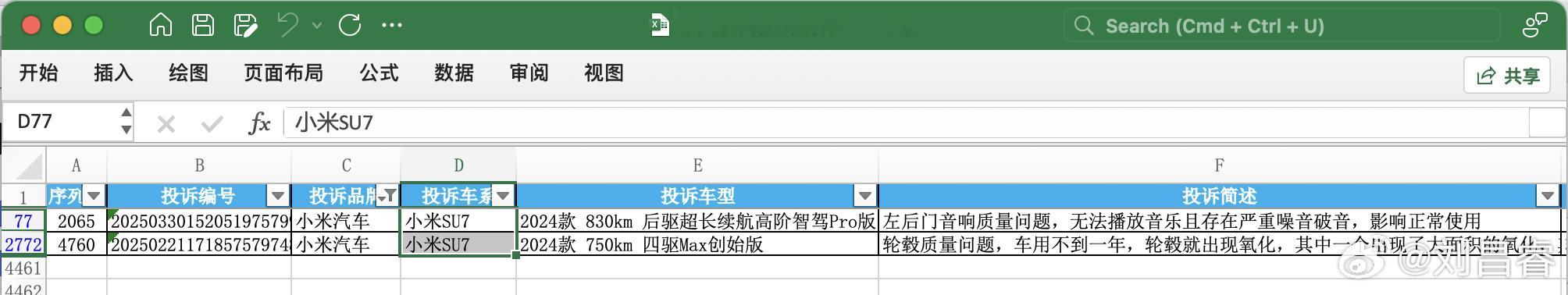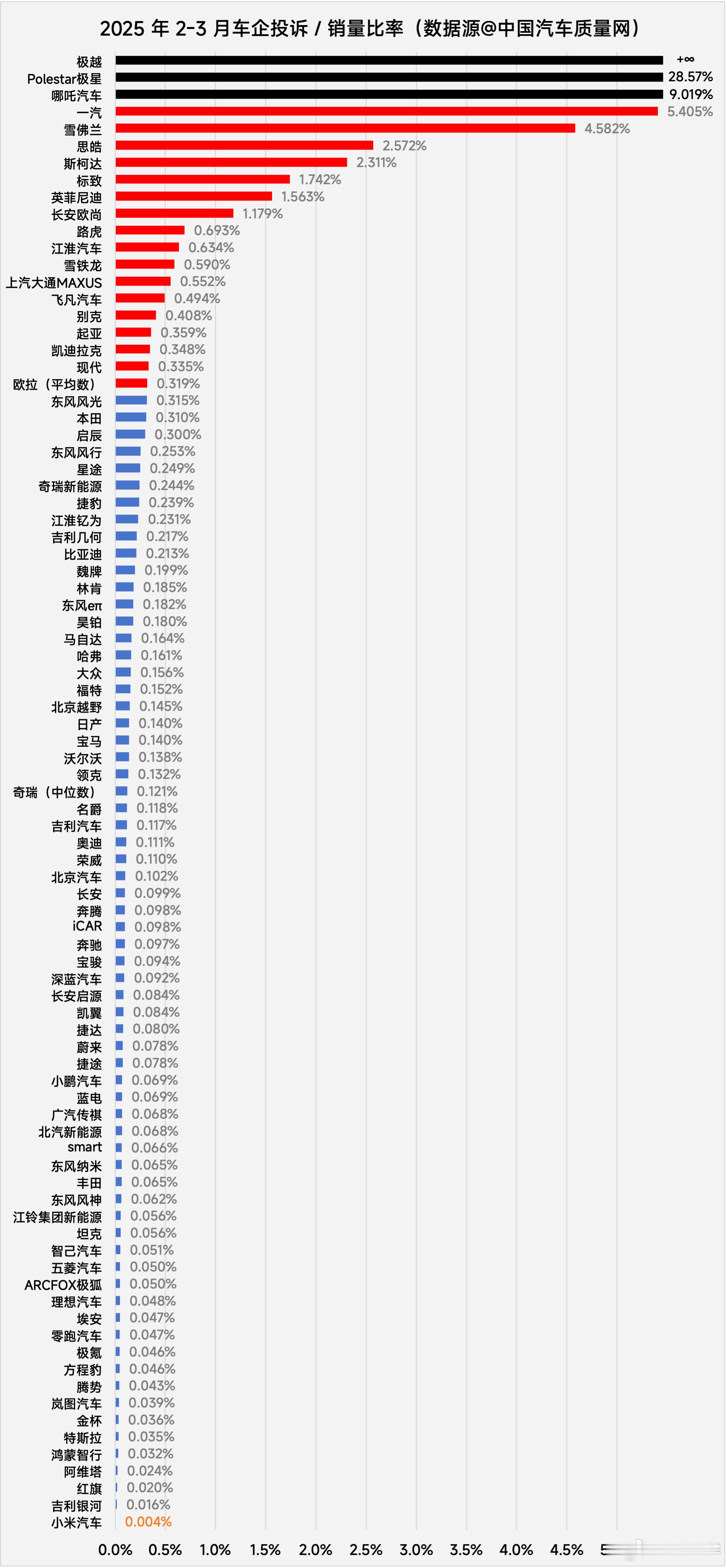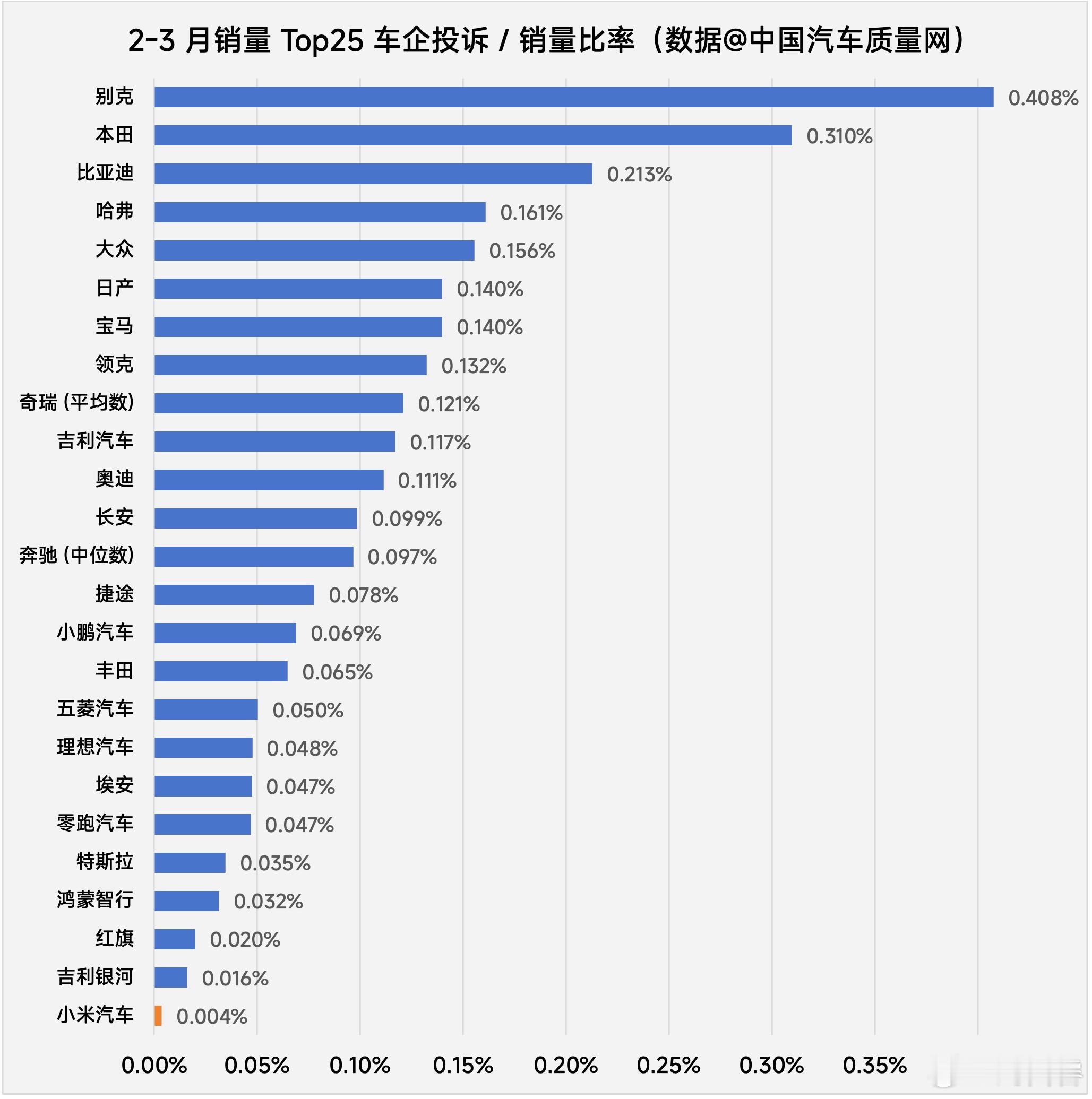相信很多朋友都看过图1这份榜单小米 SU7 被 评为 2025Q1 新能源中大型及大型车质量排行的倒数第一中国汽车质量网本身就提供投诉渠道,因此 和我爬了该网站投诉专区的所有公开记录(因为该网站只展示三个月内的记录,5.1 我们得知该事件时,就只能爬 2-3 月的记录了)大家猜猜 2-3 月小米 SU7 收到的投诉记录有几条?答案是 2 条(图2)一条是音响相关投诉,一条是轮毂外观磨损(很可能是被蹭到或泼溅到)并无明显质量问题如果这还不够有说服力,我也花时间计算了所有车企 2-3 月被投诉次数和销量的比率(图3)比如极越已经寄了,2-3 月销量是零,但还是产生了 115 条投诉,所以比率只能记为 +∞再比如极星半死不活了,2-3 月销量仅 7 台但也有 2 条投诉,因此算出来是 28.6%比亚迪的投诉数确实高达 982 条(其实很多是不满更新换代快 无关车辆质量)但因为人家卖得多,比率也仅有 0.213%,仍好于平均水平的 0.319%那么小米是多少呢?答案是 0.004%!没错,有数据的全部车企里,小米比率最低,是唯一需要拉到小数点后第三位才有数值的(如果只取到小数点后两位,四舍五入就是 0.00%)甚至在图3这个表里,最底下小米汽车的条形占不到一个像素点,所以根本没法画出来如果这还不够直观,我也筛选了 2-3 月销量 Top25 的车企,画出了图4小米汽车自然以 0.004% 的超低比率拿到冠军,只有第二名吉利银河的 1/4,更是远低于平均!行业内最低的投诉/销量比率,怎么就被 评为了质量排行榜的倒数第一呢?我不理解。当然,因为确实拿不到 1 月的投诉数据,如果你偏要说所有 SU7 的投诉都是一月产生的,那我确实也没法证伪,相信大家都有自己的判断吧~