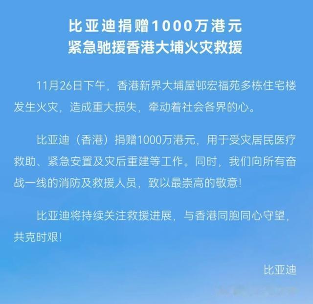 香港大埔火灾55条生命陨落,烈火中爬出31楼奇迹生还者!马云李嘉诚联手腾讯京东比亚迪等火速捐出数亿港币,全城救援与时间赛跑 (来源:每日经济新闻) 烈焰吞噬了深夜的宁静,香港大埔宏福苑的火光映红天际。这场持续数十小时的五级大火,已夺走55条鲜活生命,却也在废墟中点亮人性的微光。当救援队伍冲上31层浓烟弥漫的楼道,一位长者颤抖的双手抓住云梯的瞬间,无数人屏住呼吸——生命的顽强,从来与灾难的残酷同行。 消防员们踩着滚烫的瓦砾,逐层破门搜寻。帆布与竹棚在高温中噼啪作响,火舌如巨兽般缠绕整栋楼宇。副处长黄嘉荣嘶哑的嗓音透着力竭:“每扇门后可能是希望,也可能是绝望。”高温炙烤着钢筋水泥,也灼烧着每个等待奇迹的家庭的心。 危难时刻,中国企业巨擘们撕下商业标签,化身温暖港湾。马云公益基金会与李嘉诚基金会率先掷出3000万港元,如同暗夜中的灯塔。腾讯、京东、比亚迪紧随其后,千万级捐款如潮水涌向灾区。这些数字背后,是无数个家庭重建希望的基石。 京东的运输车在火光未熄时已抵达现场。矿泉水、饼干、泡面从佳宝超市的货架直接搬进灾民手中。物资传递的瞬间,老人眼眶泛红:“原来我们不曾被遗忘。”而阿里巴巴菜鸟网络调集的被褥与食物,正穿越夜色奔赴这场生命接力。 周大福集团的2000万港元捐款带着珠宝世家的温度,安踏的防寒装备裹住受惊的孩童,361°的救援物资堆成小山。滴滴司机们绕开封锁线,却主动接送疲惫的医护人员。这些细节编织成网,托住摇摇欲坠的人间。 恺英网络董事长金锋的900万个人捐款引发热议,网友在评论区激烈交锋:“企业家的良心是否该用金额衡量?”而蚂蚁集团开设的AlipayHK捐助通道,三小时内涌入数万笔小额转账——平民的善意从不逊于财阀。 火灾现场的视频在社交媒体疯传。灰烬中飘动的校服书包,阳台上枯萎的盆栽,半截烧焦的全家福……这些碎片刺痛着屏幕前的你我。有网友哽咽留言:“那原本是某个孩子的生日蛋糕,如今只剩焦黑蜡油。” 当消防员抱着幸存者冲出浓烟的画面传遍网络,数万条“致敬英雄”的弹幕覆盖屏幕。他们背负氧气瓶逆行时,防护服下也不过是血肉之躯。某消防员妻子在社交平台发文:“结婚三年,这是他第三次失约周年纪念。” 捐款数字持续滚动更新,而比金钱更珍贵的是行动。比亚迪捐赠千万后连夜调度电动车转运伤者;小米基金会不仅捐资,更派出工程师团队检修灾民手机通讯功能。科技在此刻回归本质——连接每个需要拥抱的灵魂。 这场火灾烧出了城市管理的隐忧,也淬炼出民族血脉里的共情。正如网友所说:“灾难面前没有港岛与内陆,只有黄皮肤下的赤子之心。”当黎明终至,废墟上会重新长出炊烟,而此刻我们紧握的双手,便是最好的诺言。 香港火灾救援 企业社会责任