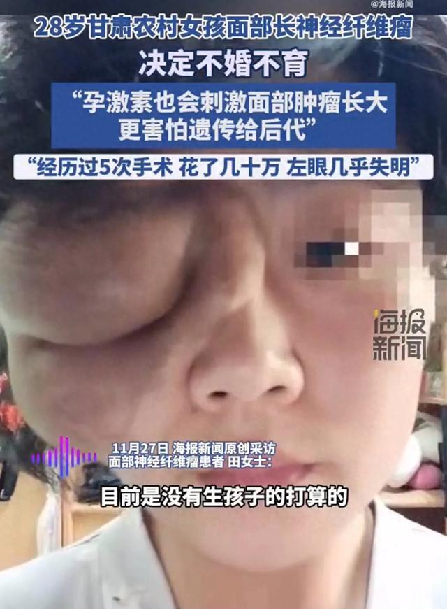 11月27日,甘肃定西,28岁女孩田女士面部长巨型神经纤维瘤,至今已经历过5次手术,花了几十万,左眼几乎失明了。田女士表示,“孕激素会刺激面部肿瘤长大,也更害怕遗传给后代”,因此她决定今后不婚不育,父母和哥哥也一直支持她做的每一个决定。(海报新闻)