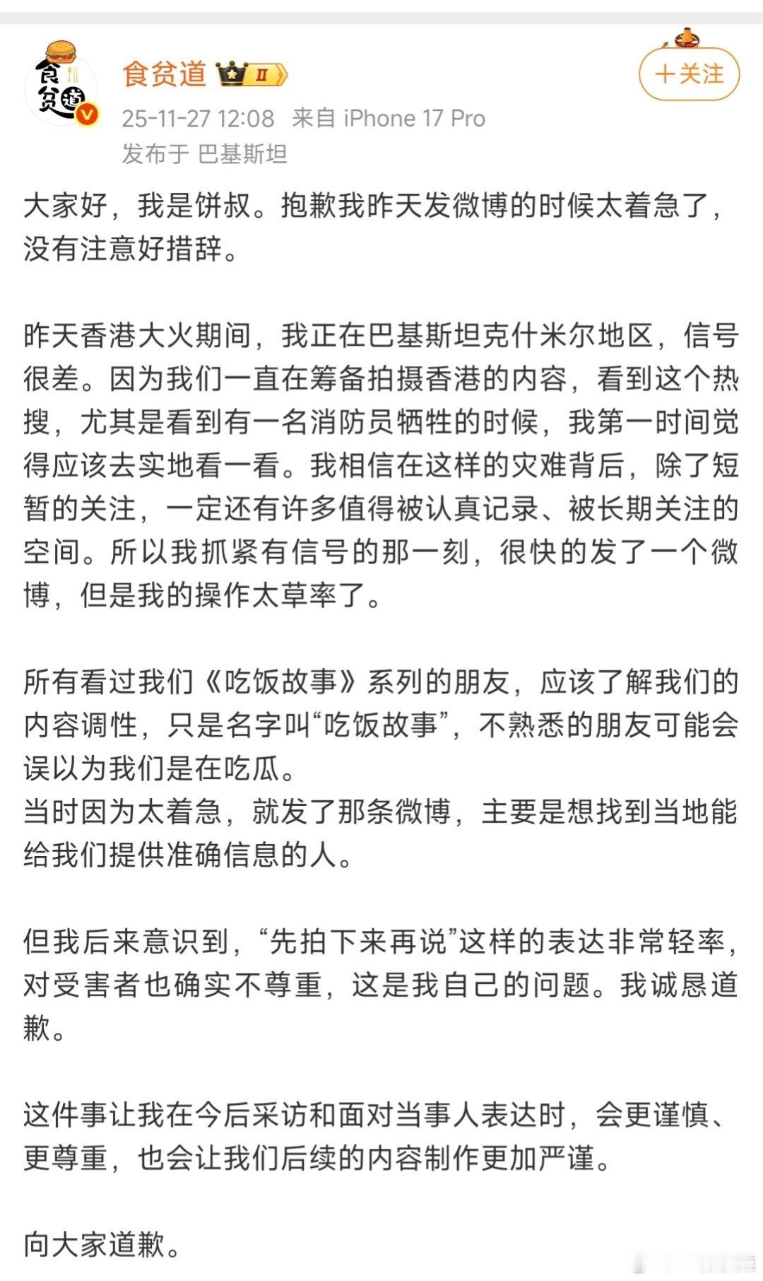 食贫道道歉了,表示自己太着急了,没有注意好措辞。香港火灾,那条博文确实不应该,显