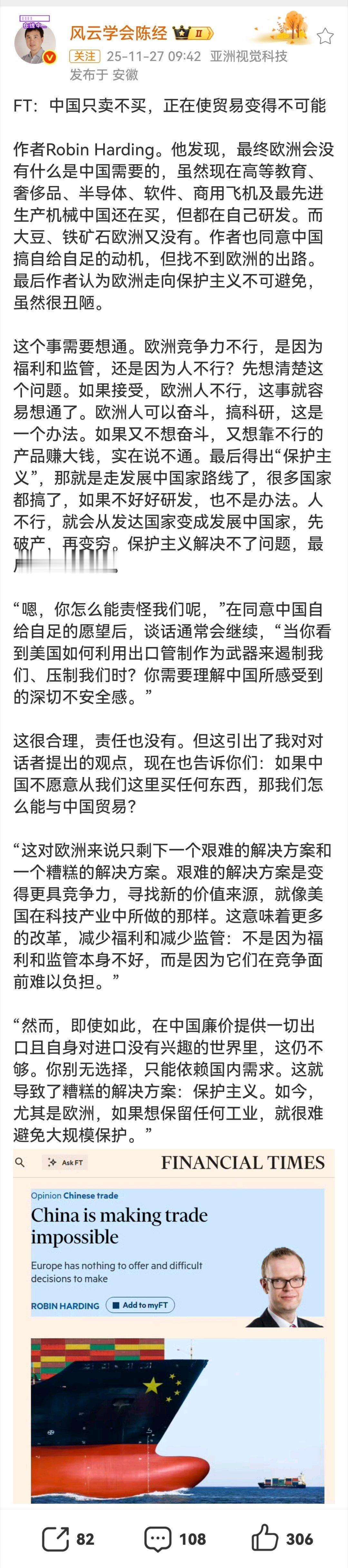 英国《金融时报》发表了一篇文章“批评中国”出口过多,而进口过少。这完完全全就