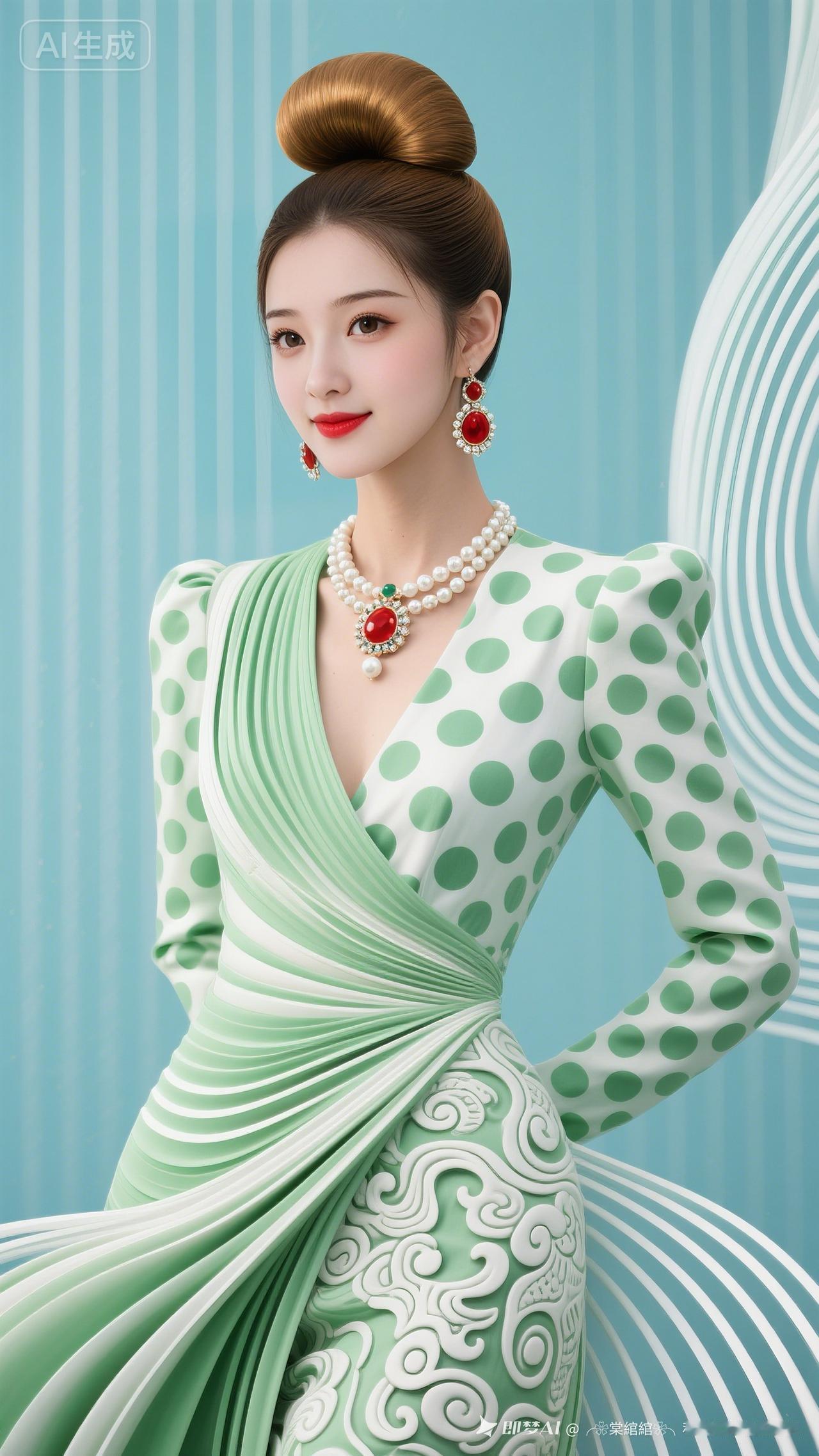 俊女金棕高盘发,淡苹果绿白波点高定套装立体,华丽配饰点睛,横竖线条交织,浮雕纹样暗藏,尽显东方清冷与国潮张力,如画卷走出的时尚杰作。