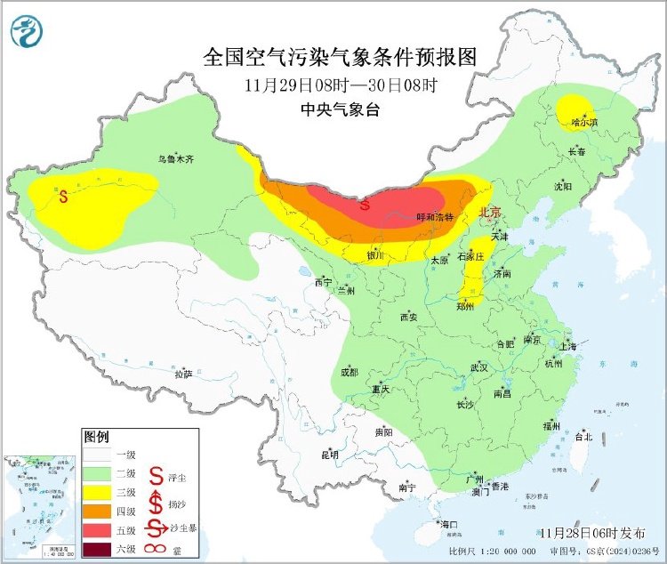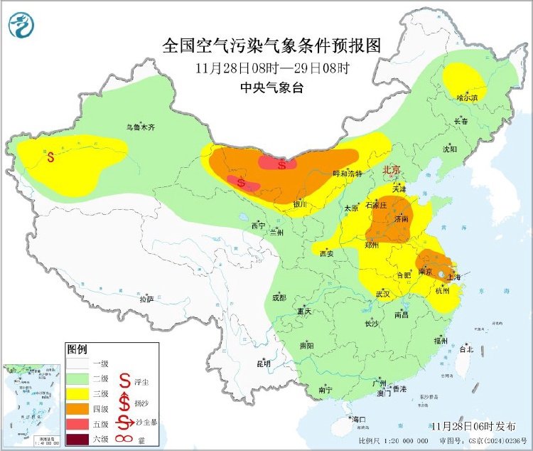 28日至30日,内蒙古中西部、甘肃河西地区、宁夏、陕西中北部、华北北部等地的部分地区有扬沙或浮尘天气。