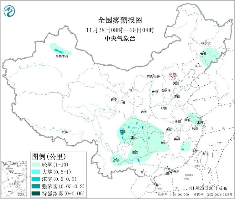 此外,28日早晨至上午,四川盆地中西部等地的部分地区有大雾天气,局地能见度不足200米。