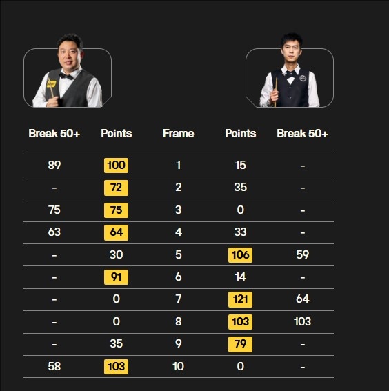 张安达打出三杆50+(89、75、63、58),塔猜亚·乌努打出一杆破百(103)和两杆50+(59、64)。