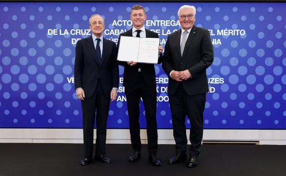 在伯纳乌荣誉包厢举行的仪式上,克罗斯被授予德国功绩勋章骑士十字勋章。德国总统施泰因迈尔亲自为这位皇马传奇和世界足坛巨星颁发了这一荣誉。出席授勋仪式的还有皇马名誉主席何塞·马丁内斯·皮里、机构关系总监布特拉格诺、主帅阿隆索、球员巴尔韦德、吕迪格,以及皇马传奇球员罗伯托·卡洛斯、阿韦罗亚和索拉里。