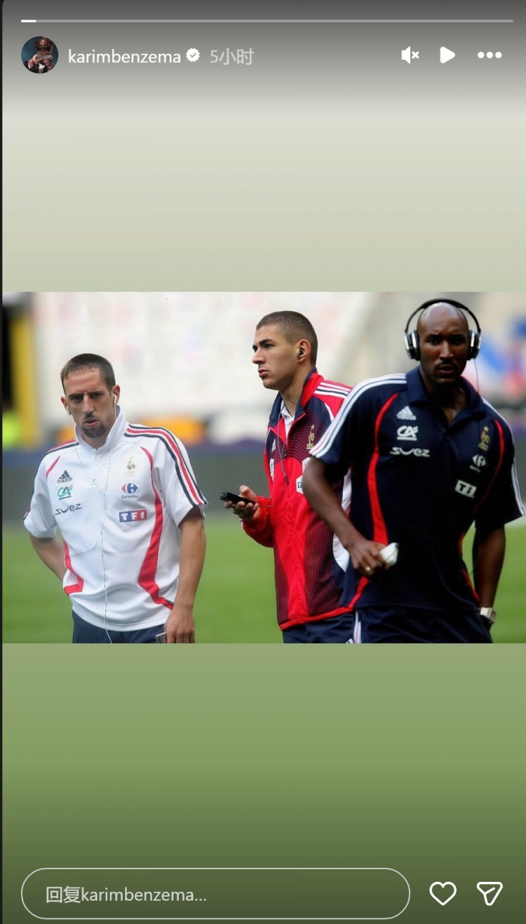本泽马社媒晒出自己昔日在法国队的照片,里贝里、阿内尔卡出镜。