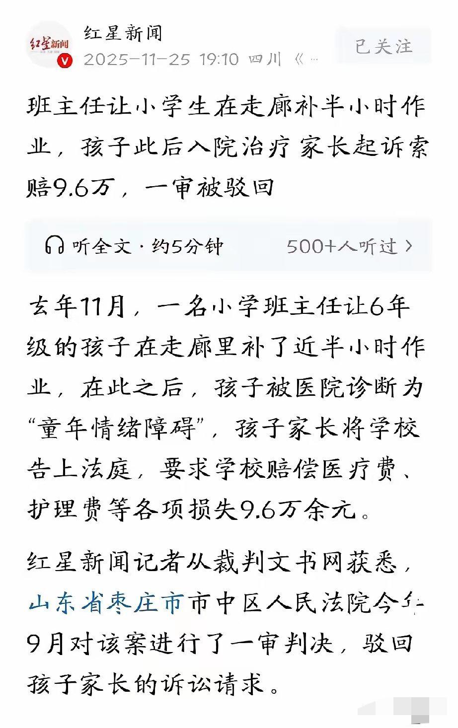 山东六年级娃教室外罚补作业,孩子突发疾病,家长索赔9.6万。山东枣庄某小学,多名小学生没做作业,老师把这些学生赶到走廊补作业,读过书的都有类似经历。其中一个学生突发精神不正常,老师立即联系家长,家长以忙为理由不来,老师安排两同学护送。孩子后来被鉴定为童年情绪障碍,家长把学校告了,说孩子患病和这次罚作业有关。法院审理后,驳回家长诉求。