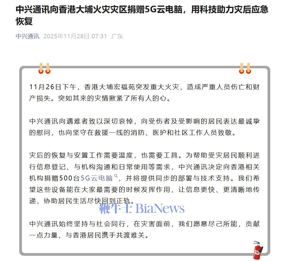 11月28日,中兴通讯宣布,向香港大埔火灾灾区捐赠500台5G云电脑,并将提供同步的部署与技术支持。