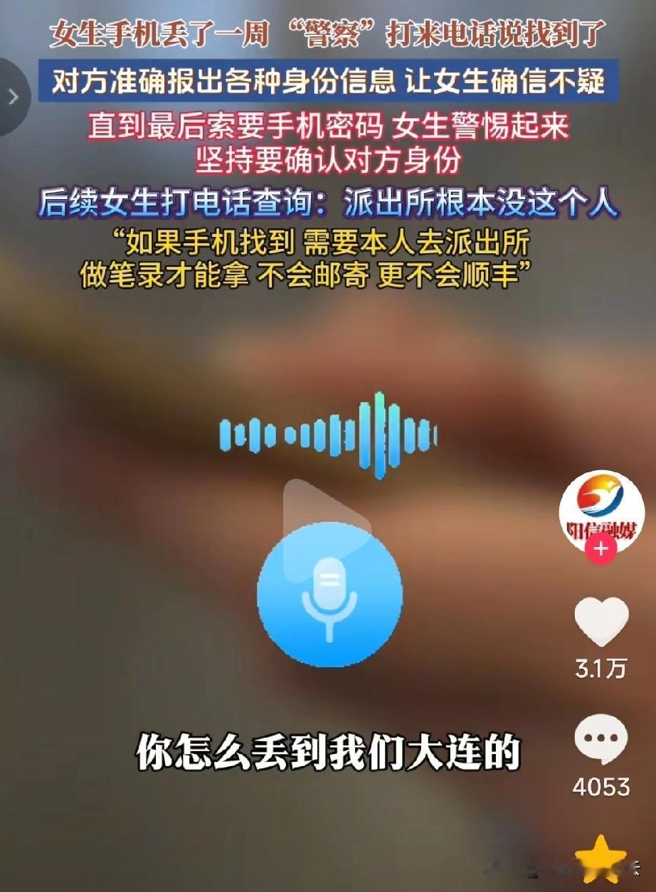 看到一个新型骗局,很容易就中招。女子去西安玩时,丢了一部苹果手机,她报警后,警方说不容易找到。结果有天她接到一个电话,对方自称是大连的警察,找到她的手机了,需要和她核实一下。 对方准确的说出了女孩的姓名、住址什么的,这让女孩对他的身份深信不疑。女孩听说手机找到了,很兴奋。她说自己是外地的,需要警方给她邮寄一下手机。 对方很爽快的答应了,还说会给她用顺丰寄。就在女孩庆幸手机找到时,对方问她要手机的屏保密码,女孩很聪明,她的警惕心一下子上来了。她说这个我不能告诉你,她问对方是以什么身份要这个的呢? 对方说自己是大连派出所的,报出了自己的名字,还有警号。女子还是不放心,她说那为什么要说密码呢?对方看女子起了疑心,连忙说也不用都说,6个数字密码说前4位就行。 女孩还是说,不行,我需要核实一下你的身份再说。 对方那边催她,顺丰已经过来了,很多手机在寄出了,你不说今天就寄不出去了。女子说那明天也行。对方看骗不下去了,就挂了电话。 女孩接着给大连派出所打了电话,结果人家那边说根本没有这个人。她又给西安派出所打了电话,警方上来就告诉她这是假的,如果真找到了需要本人去派出所做笔录,警方不会给邮寄,更不会用顺丰。 有网友说,学到了。女孩真聪明,如果是我,一高兴估计什么都告诉他了。 确实,骗子的语速、话术都很专业,如果没经历过的还真容易被骗了。不过大家记住一点,警方不会给你寄东西,必须你自己去派出所拿。 对于这件事,你怎么看呢?