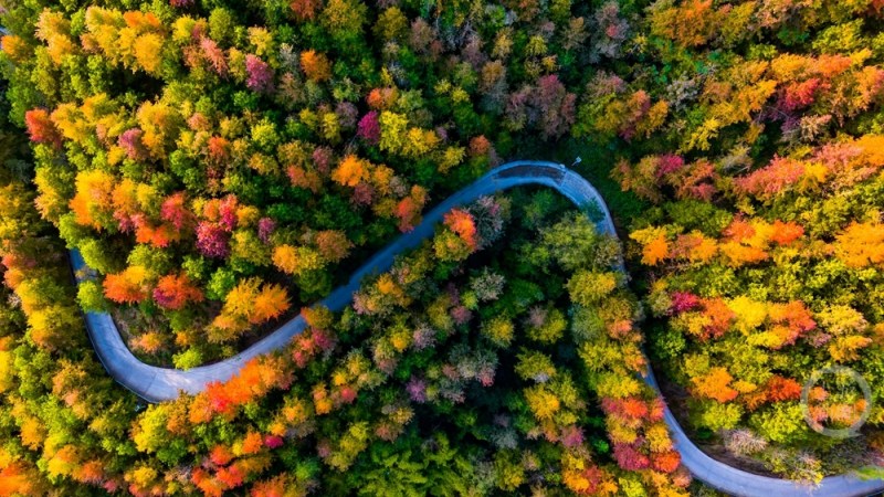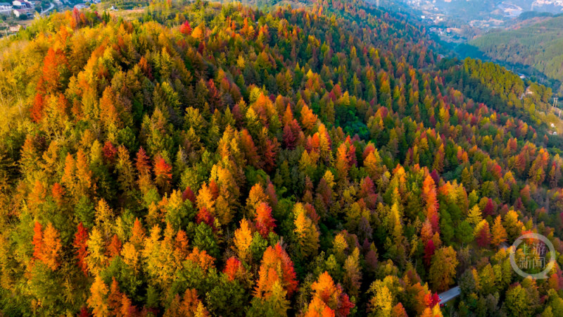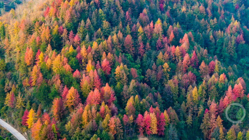 从空中俯瞰,各色树叶层层叠叠,交相辉映。