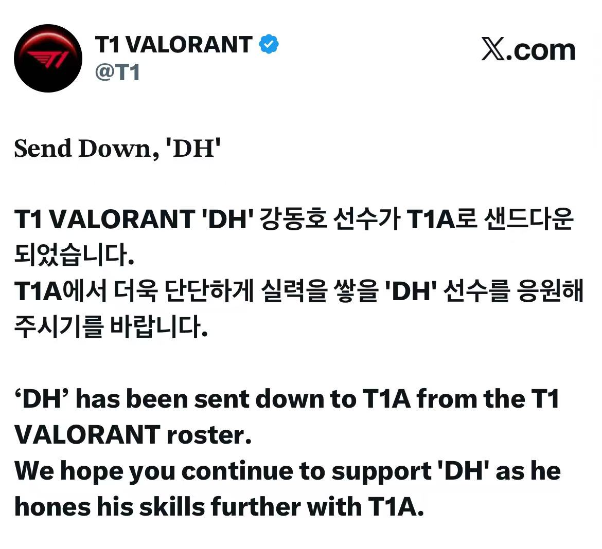 与此同时,T1也同步公布了队内阵容调整情况。主队选手DH已从一队下放至T1A继续锻炼。T1在公告中表示,希望DH能在T1A中进一步打磨个人实力,并呼吁粉丝继续给予他支持