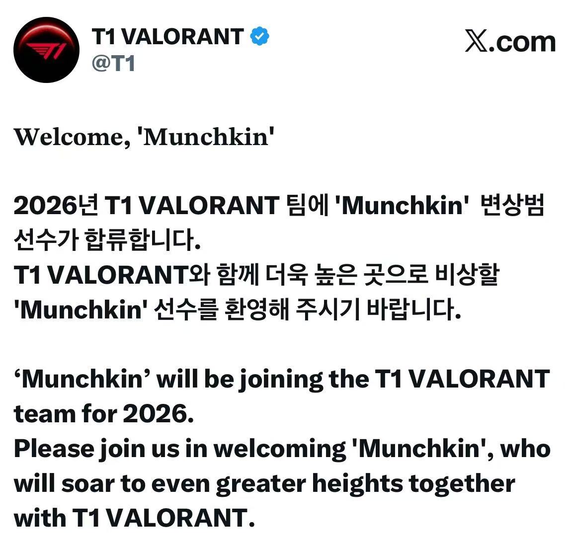 “Munchkin将在2026赛季加入T1无畏契约分布,请大家一同欢迎他的到来,并期待他与T1携手向更高的舞台进发