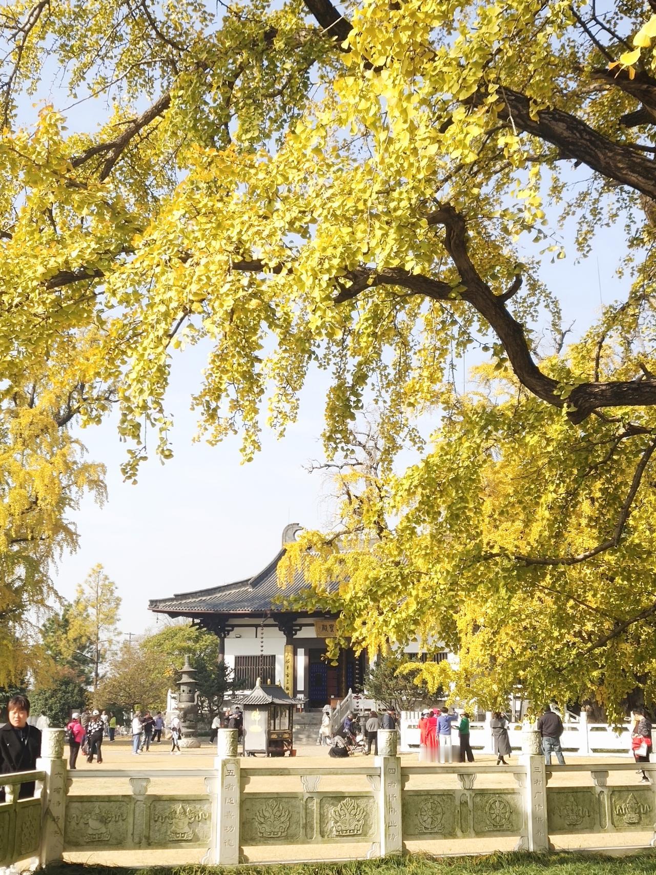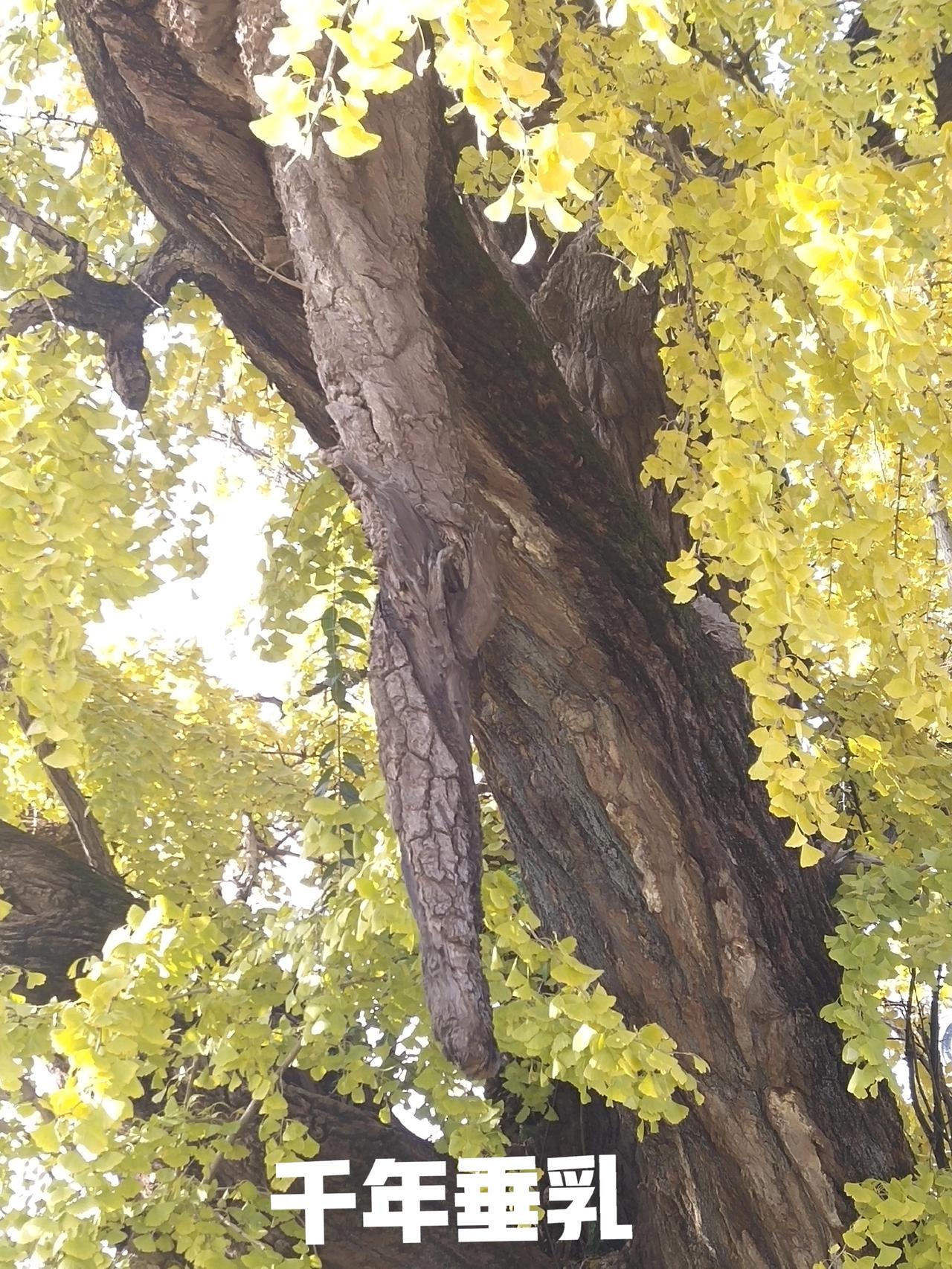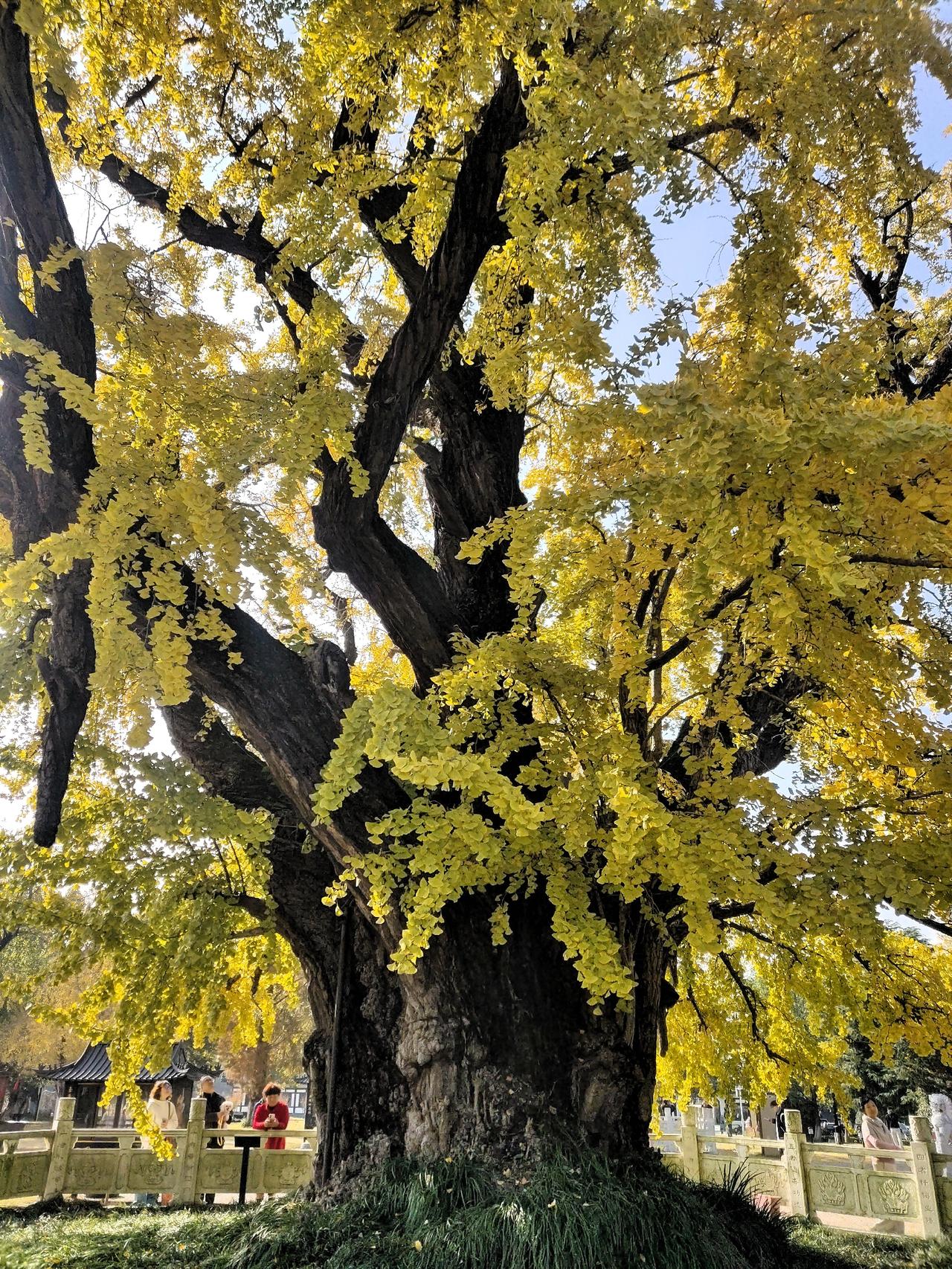 前两天又去南京古惠济寺看1500多岁的古银杏了,这几年每到银杏叶黄了的时候,我都会去仰望一下三棵银杏古树,如同探望一位饱经沧桑的古人。 这几棵银杏树是南朝昭明太子在此读书时种下的,经过1500多年岁月洗礼,依然能散发勃勃生机,可见这几棵树顽强的生命力。 名为“千年垂乳”的这棵树,为了生存,靠近根部的树枝上,长出了大大小小的气根,最长的气根有一米多长,甚为壮观。 名为“雷击复苏”的这棵树,曾经被雷电劈中烧了几天几夜,树干都烧空了,却在五年后神奇复苏,长出新芽,现在又是枝繁叶茂。 名为“撑天覆地”的那棵树,巨幅树冠可以供一千多人纳凉,树干需七个成年人手拉手才能合围。 我去的时候这三棵银杏树叶子全黄了,已经到了最佳观赏期。站在古树旁,听着播放器里传送的佛经诵读,我虽然听不懂,但仍能感受到宁静和愉悦。