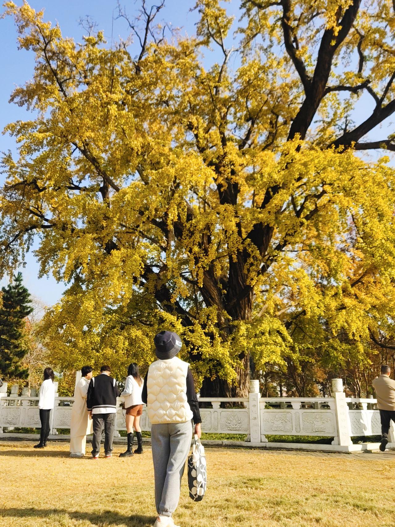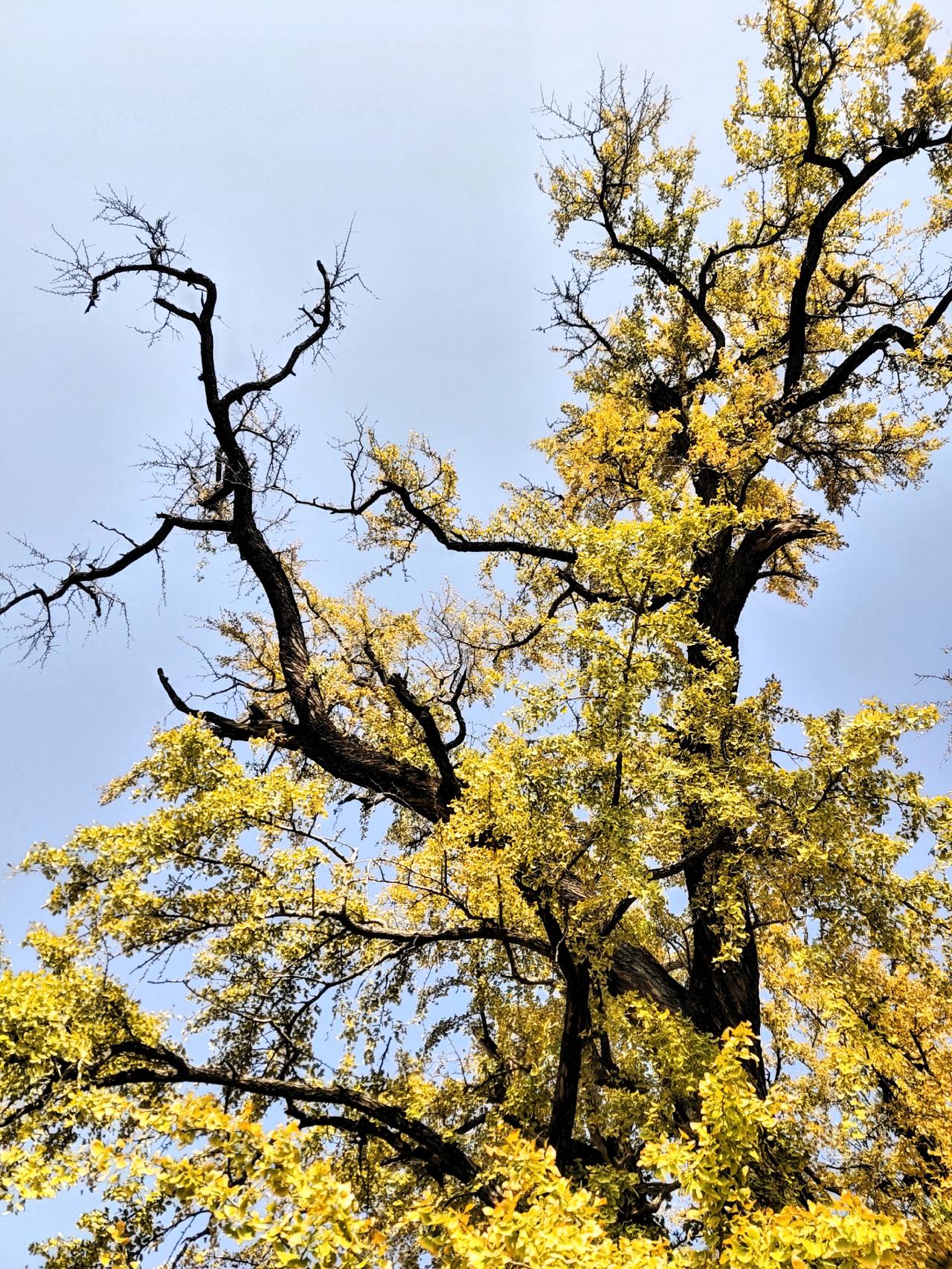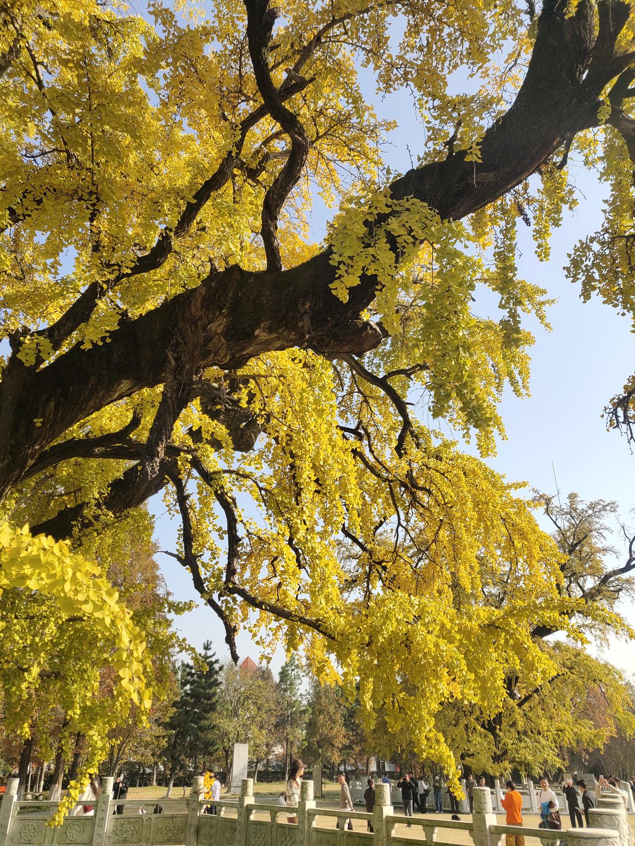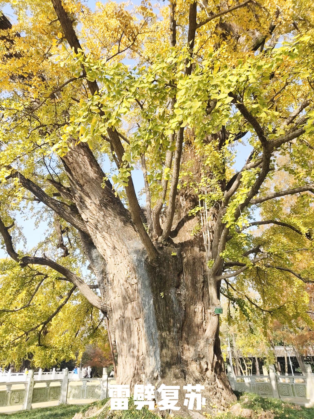 前两天又去南京古惠济寺看1500多岁的古银杏了,这几年每到银杏叶黄了的时候,我都会去仰望一下三棵银杏古树,如同探望一位饱经沧桑的古人。 这几棵银杏树是南朝昭明太子在此读书时种下的,经过1500多年岁月洗礼,依然能散发勃勃生机,可见这几棵树顽强的生命力。 名为“千年垂乳”的这棵树,为了生存,靠近根部的树枝上,长出了大大小小的气根,最长的气根有一米多长,甚为壮观。 名为“雷击复苏”的这棵树,曾经被雷电劈中烧了几天几夜,树干都烧空了,却在五年后神奇复苏,长出新芽,现在又是枝繁叶茂。 名为“撑天覆地”的那棵树,巨幅树冠可以供一千多人纳凉,树干需七个成年人手拉手才能合围。 我去的时候这三棵银杏树叶子全黄了,已经到了最佳观赏期。站在古树旁,听着播放器里传送的佛经诵读,我虽然听不懂,但仍能感受到宁静和愉悦。