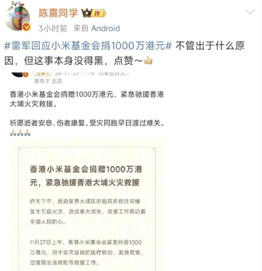 陈震道歉了,自称表述不清,而不是阴阳小米,道歉还算及时。[机智] 这话仔细一琢磨还真让人别扭,似乎揣测过于恶意。大灾面前,吃瓜群众有钱出钱,有力出力,而不是只靠一张嘴啊 陈震 小米