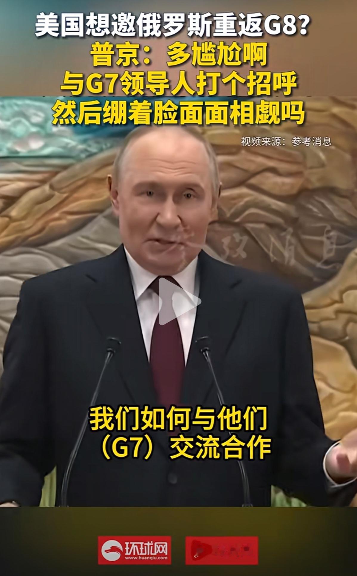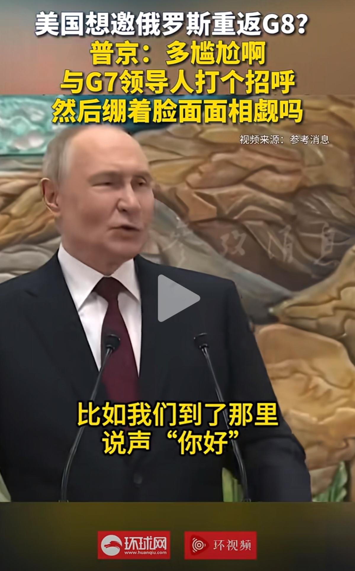 美国想让俄罗斯重返G8?正如普京所说,这确实挺尴尬的,俄罗斯和G7之间都剑拔弩张了,见面要怎么打招呼呢?不会又把普京单独晾在那里吧!那还不如不去参加这种会议。而且万一泽连斯基也去参加怎么办?这让普京和泽连斯基怎么办?所以说,俄乌战争结束之前,俄罗斯是不会重返G8的。