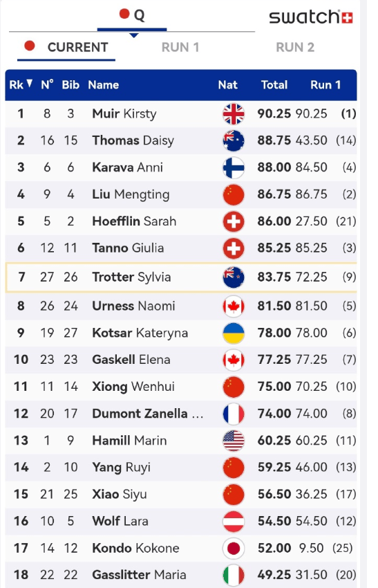 虎扑11月28日讯国际雪联单板滑雪及自由式滑雪大跳台世界杯女子自由式预赛,中国选手刘梦婷86.75分排名第四,晋级决赛。