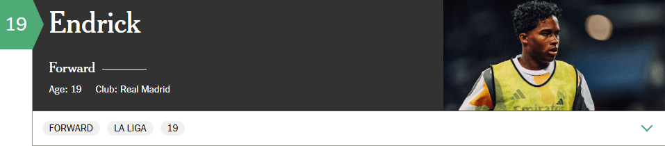 皇马在2022年从帕尔梅拉斯签下了当时年仅16岁的恩德里克——这位前锋将在2024年夏天年满18岁时正式转会西班牙,转会费为3500万欧元固定转会费外加2500万欧元附加条款。
