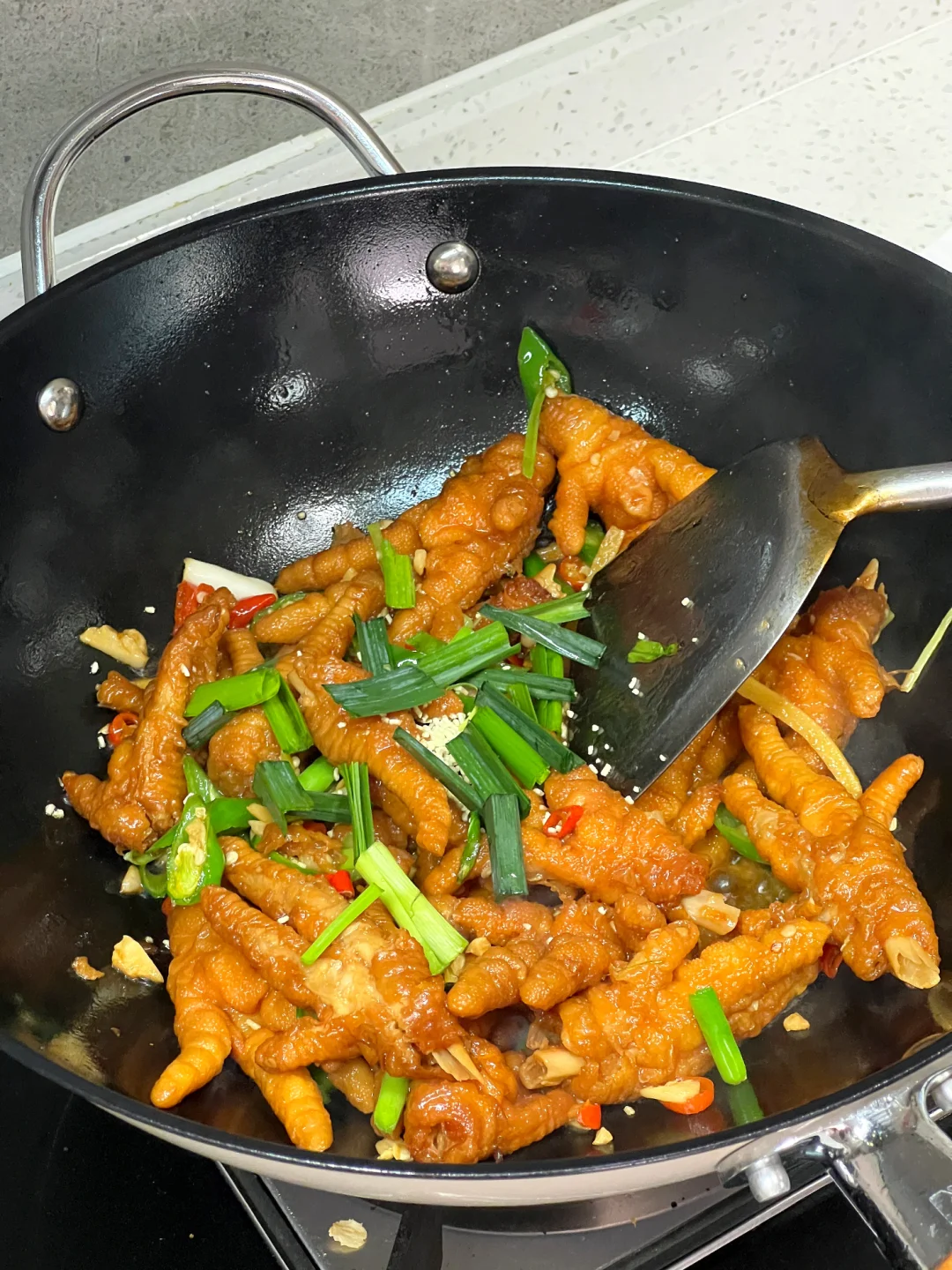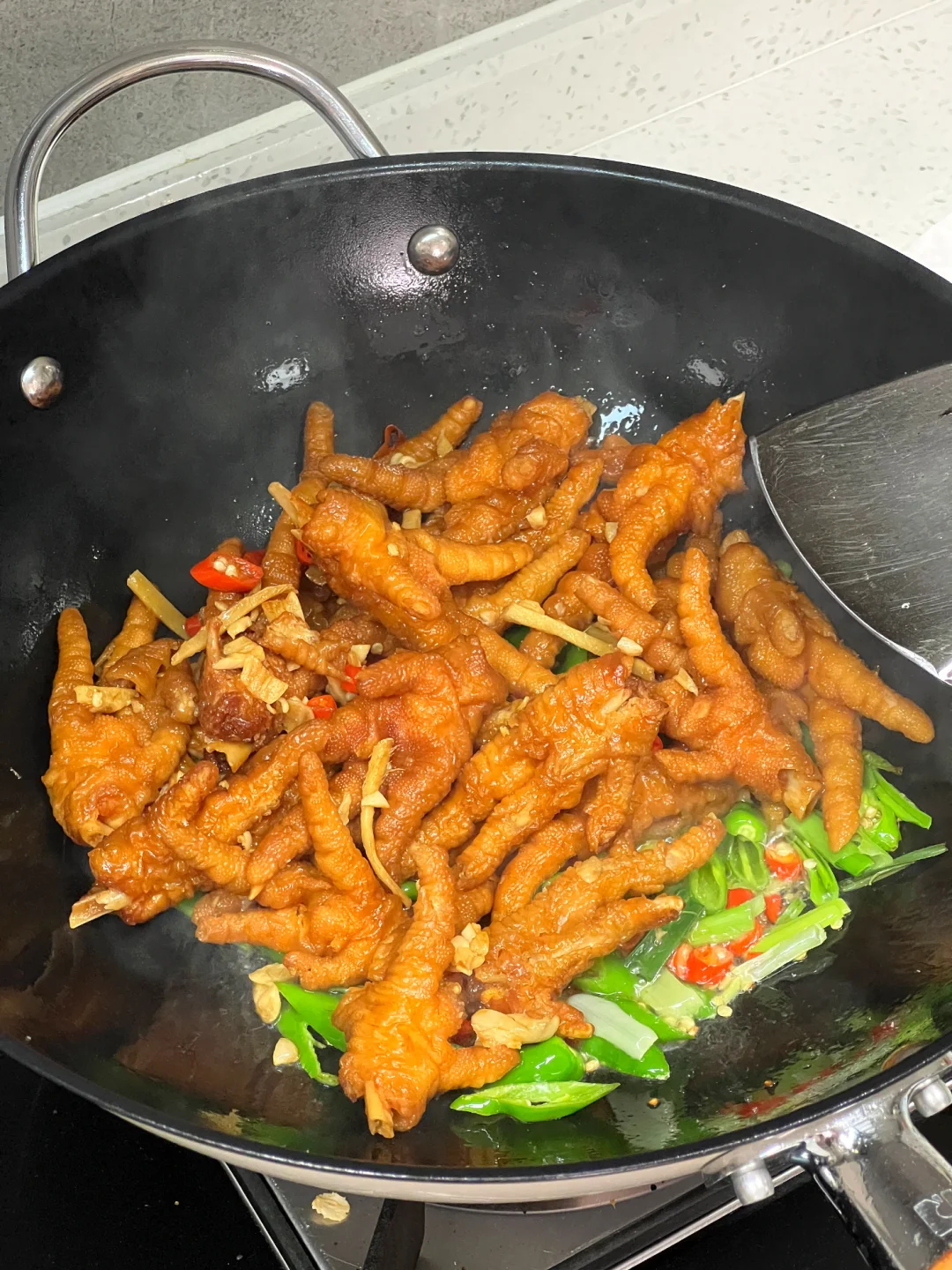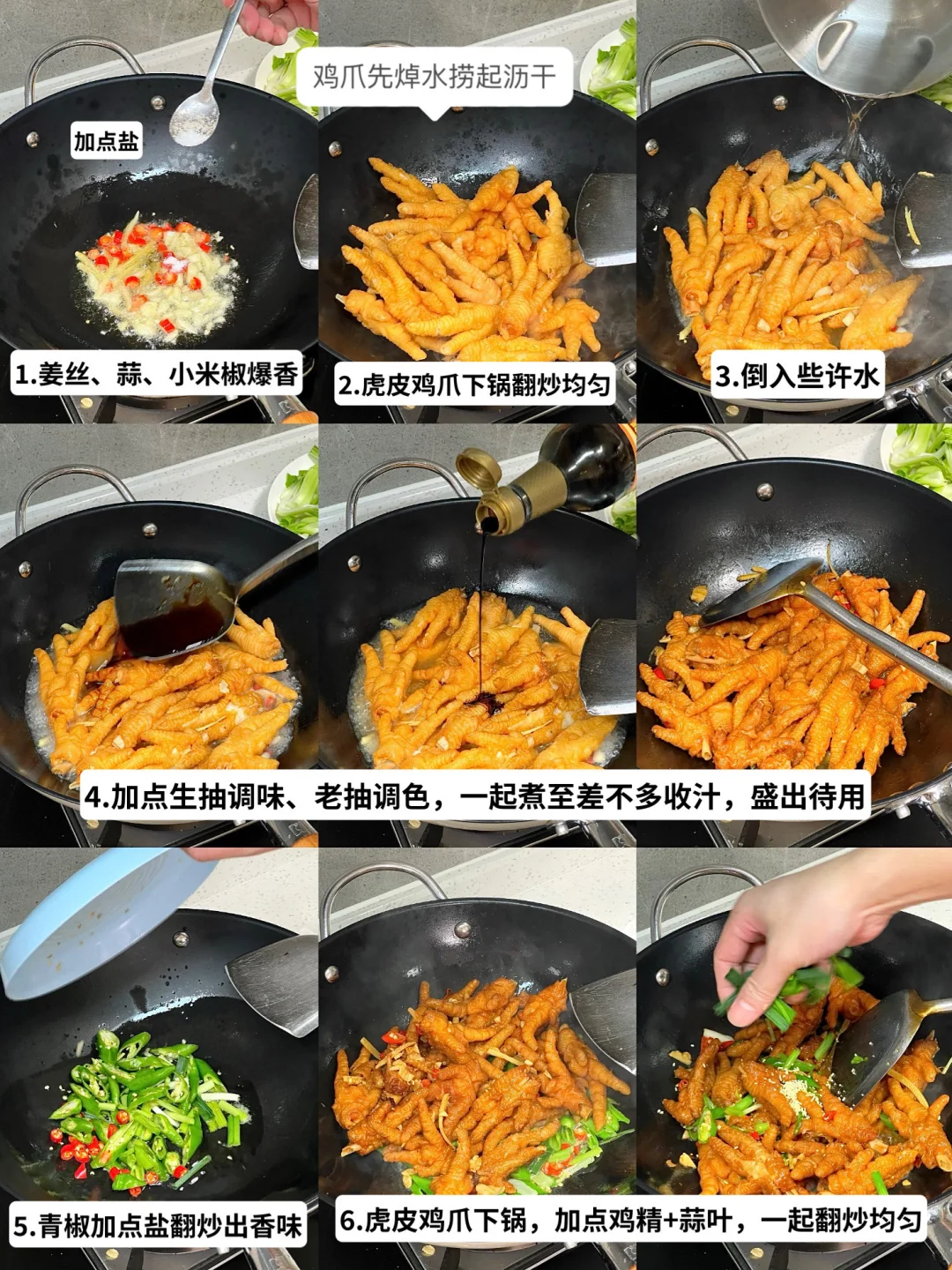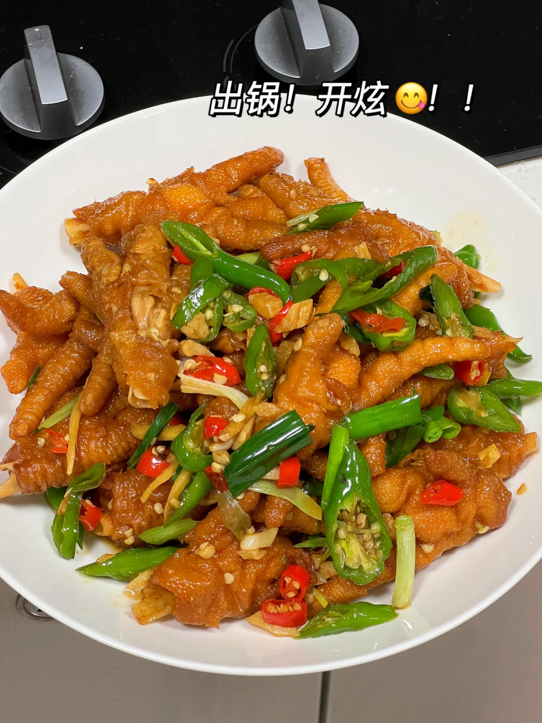 虎皮鸡爪是去菜市场凉拌菜摊上买的半成品 没要老板的调料?? 男朋友拿回家自己加点青椒一顿爆炒,又是一道家常快手菜 连里面青椒都好好吃[色色R] ??食材基础 虎皮鸡爪(又叫凤爪) 青椒,小米椒,蒜叶,蒜末,姜丝 ???????吃法就不基础 1.虎皮鸡爪,三件套焯水去腥(品质好、味道好不焯也行) 2.姜丝、蒜末、小米椒,加点盐爆香 3.虎皮鸡爪下锅翻炒均匀,加点水 4.接着加点生抽调味,老抽调色,一起煮至收汁(喜欢带汤汁的,可以留点汤),盛出待用。 5.青椒、小米椒,加点盐炒香 6.待用的虎皮鸡爪下锅,加点蒜叶、蚝油、鸡精,翻炒均匀。 吃饭的时候男朋友反复跟我说:老家的凤爪味道更好,炒出来的更好吃。听的我好馋??,好想回赣州吃好吃的… ??Tips 我的口味更是喜欢炒的干香干香的 男朋友喜欢加点淀粉、生抽、老抽、蚝油调汁,最后炒出来能留点汤汁,更顺滑的口感。 大家根据自己的口味进行调节哈[自拍R]
