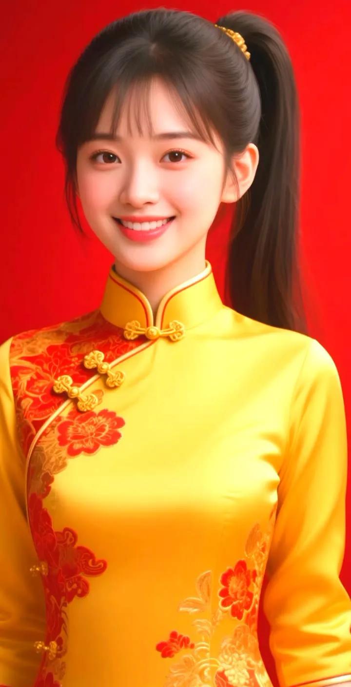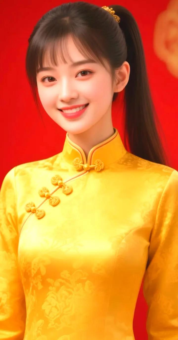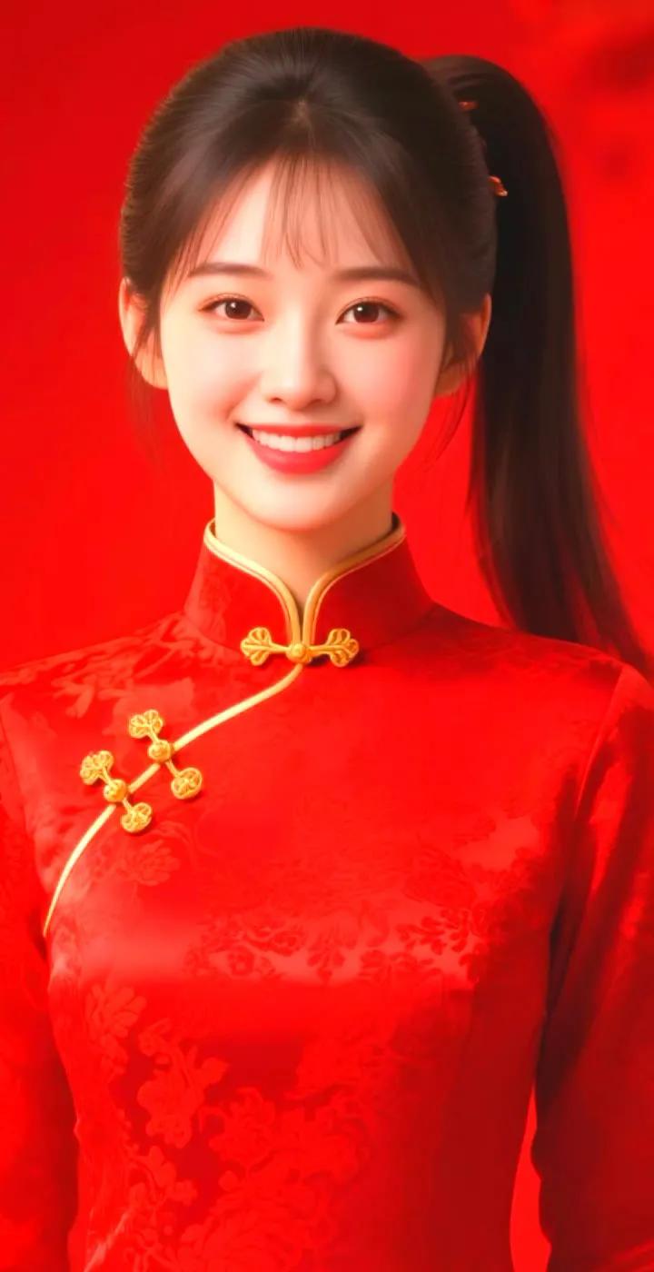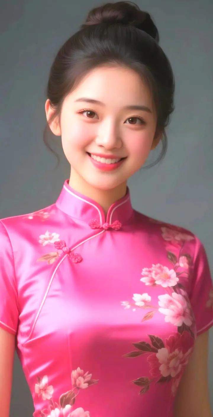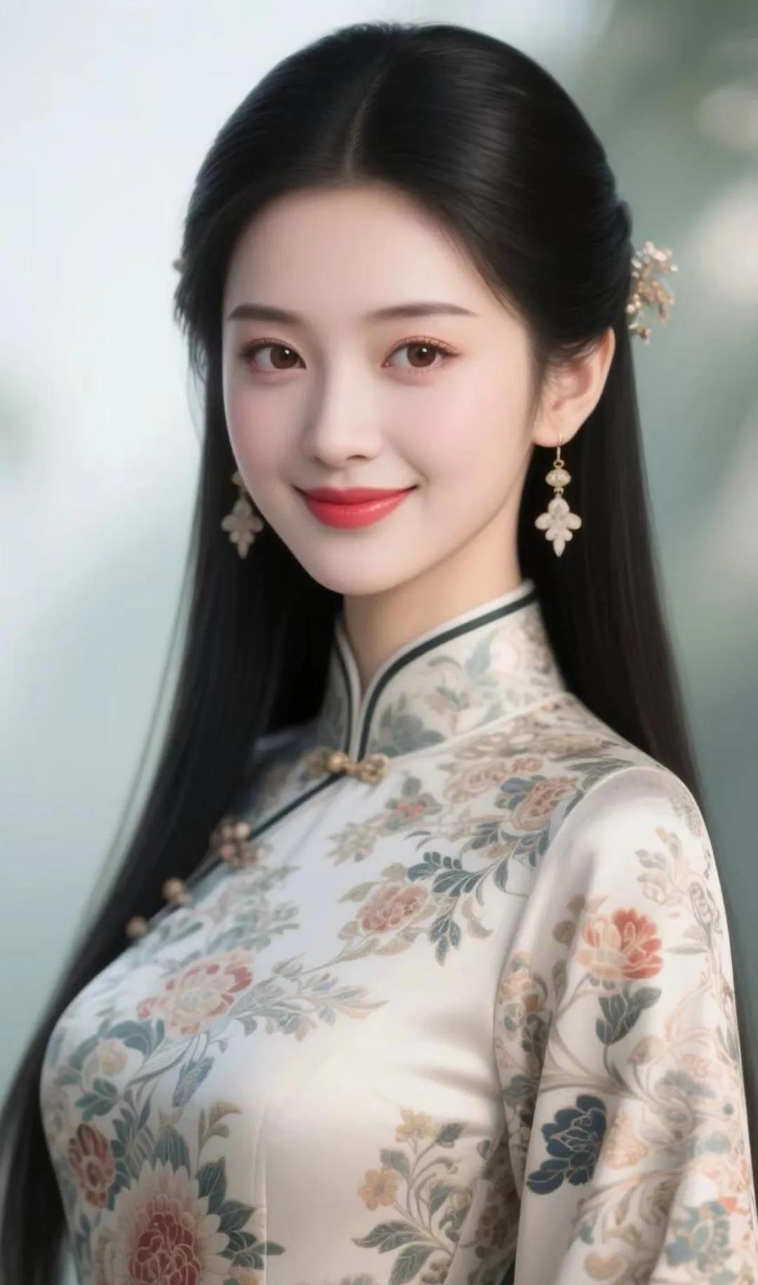 缎面旗袍裹着清浅的春,盘扣轻挽,花影落在肩头。发梢坠着柔风,笑意里是江南揉碎的软