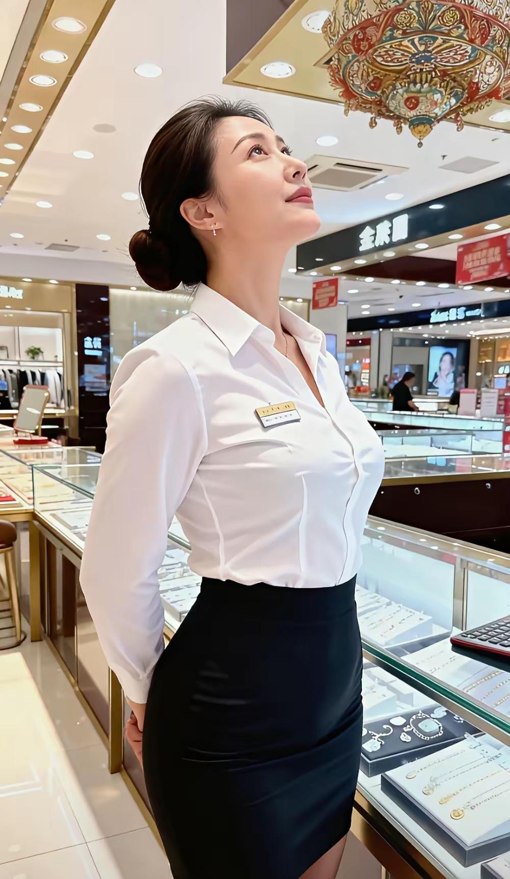 她美得优雅又高级,乌黑秀发高盘成精致发髻,侧颜线条如流水般柔美。白色衬衫勾勒出纤细腰肢,黑色包臀裙衬出曼妙曲线。指尖托着珠宝展架,目光专注温柔,耳尖小钻耳钉与颈间细链呼应,每一寸都透着知性与精致。店内暖光洒落,她似星光下的明珠,温婉与干练交织,让人移不开眼。温柔高贵的女性 高贵的气质女人 温婉大方的美女 温柔气质美女 职场气质女人 温婉长发少女 卓越气质女性 气质长发女孩 美女人像群