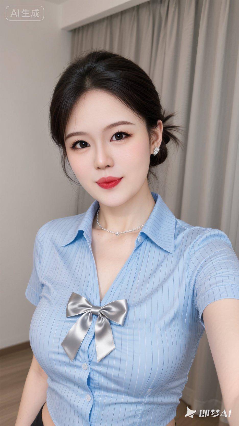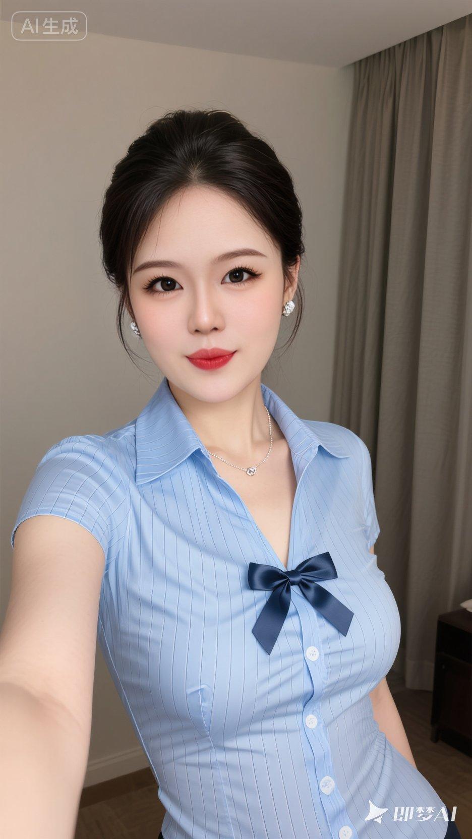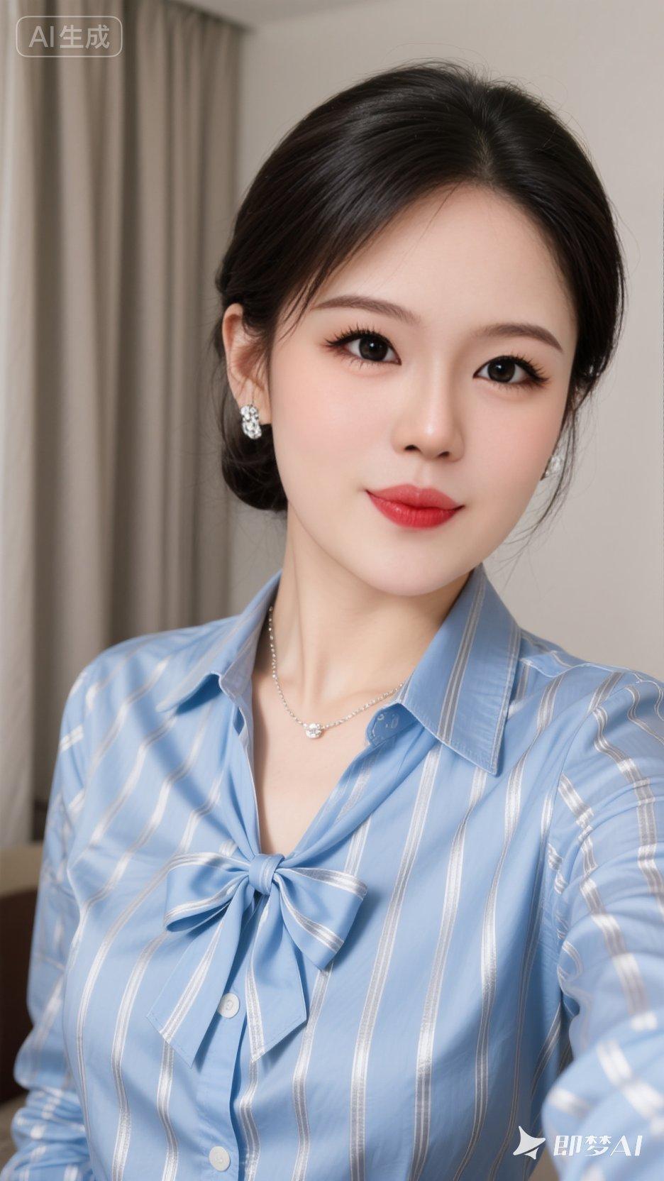 平面视角,看着镜头,网红美女自拍照,脸型精致妆容精致鼻梁高挺,皮肤白皙,底妆通透,肤色均匀自然,纯欲风,发丝清晰可见冷白皮盘发,细项链,纯欲风,穿搭蓝银条纹开领衬衫,领口有蝴蝶结装饰,葫芦形S身材