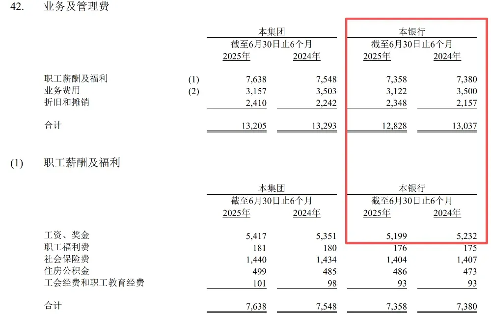 上半年,华夏银行职工薪酬及福利支出73.58亿元,较去年同期减少0.22亿元。其中,工资、奖金51.99亿元,同比减少0.33亿元。以上述口径计算,华夏银行母行员工2025上半年人均工资约为14.14万元,较去年同期增长约5%。