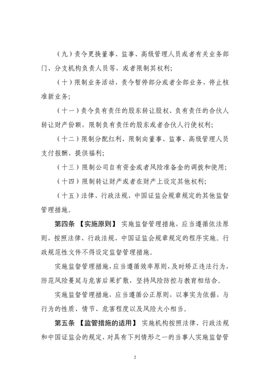 据介绍,“监督管理措施”,简称“监管措施”,是金融监管的重要手段。此前,证监会于2008年制定了《证券期货市场监督管理措施实施办法(试行)》,对监管措施的调整范围、适用原则、种类、实施程序等作了规定。
